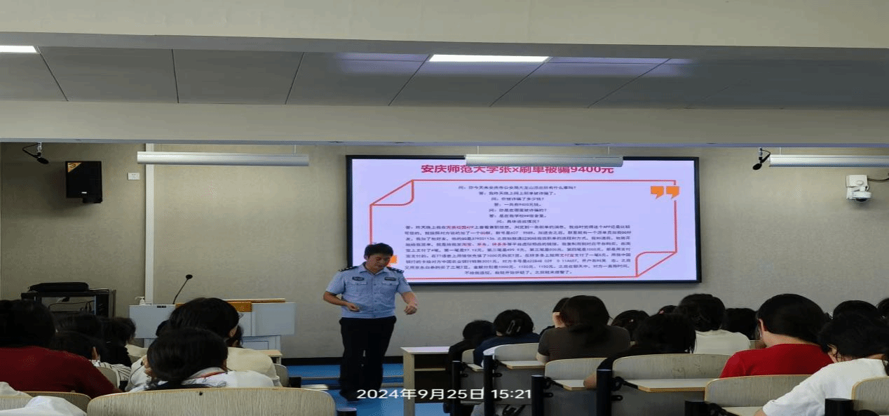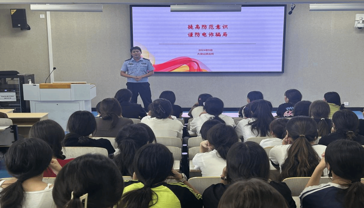 2024 年 9 月 25 日,为提高师生的反诈意识,守护校园财产安全,中职班特邀大龙山派出所民警来到校园,开展“提高防范意识 谨防电信诈骗”主题反诈宣讲活动,合力筑牢大学生们的安全防范意识。
