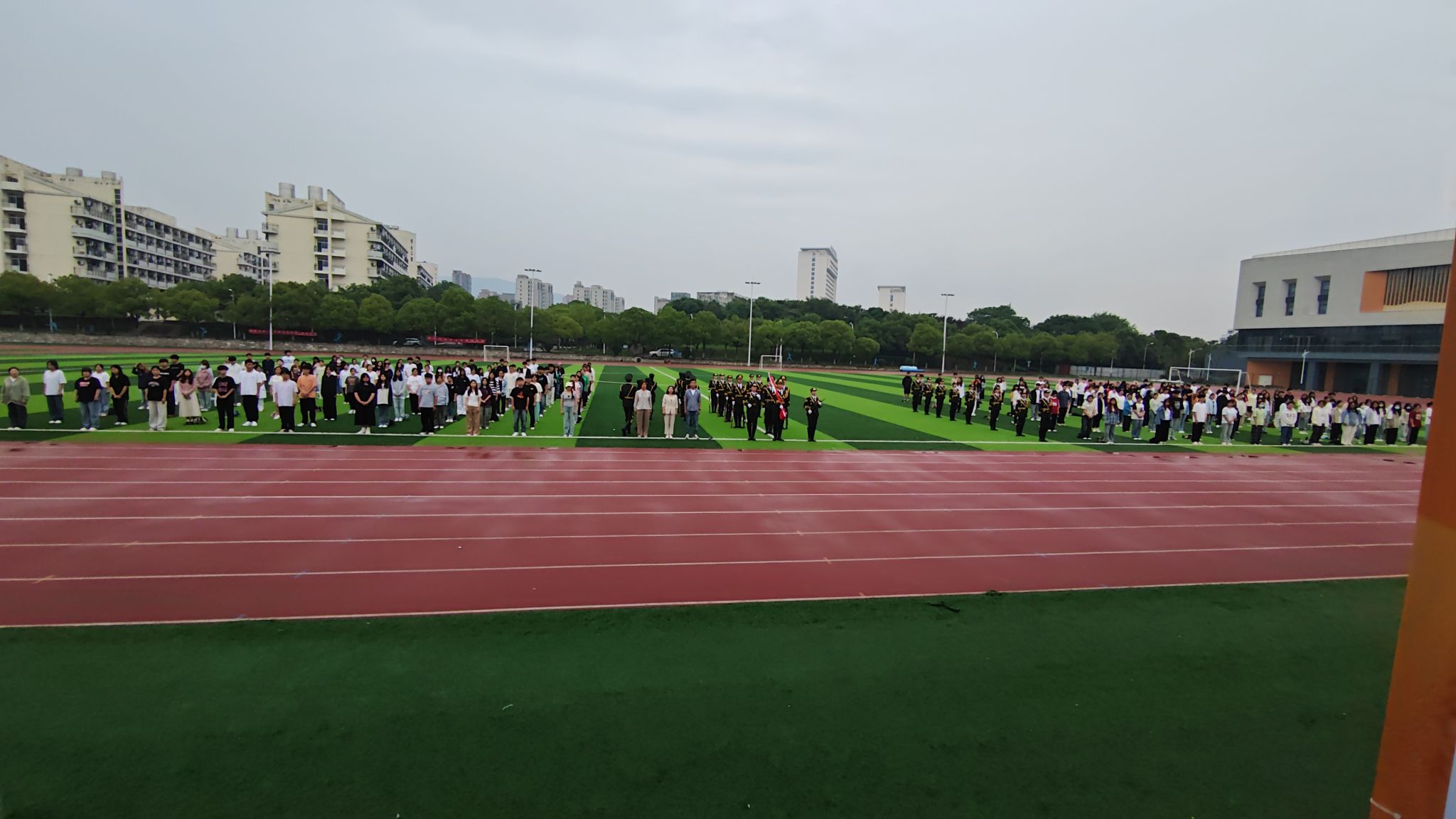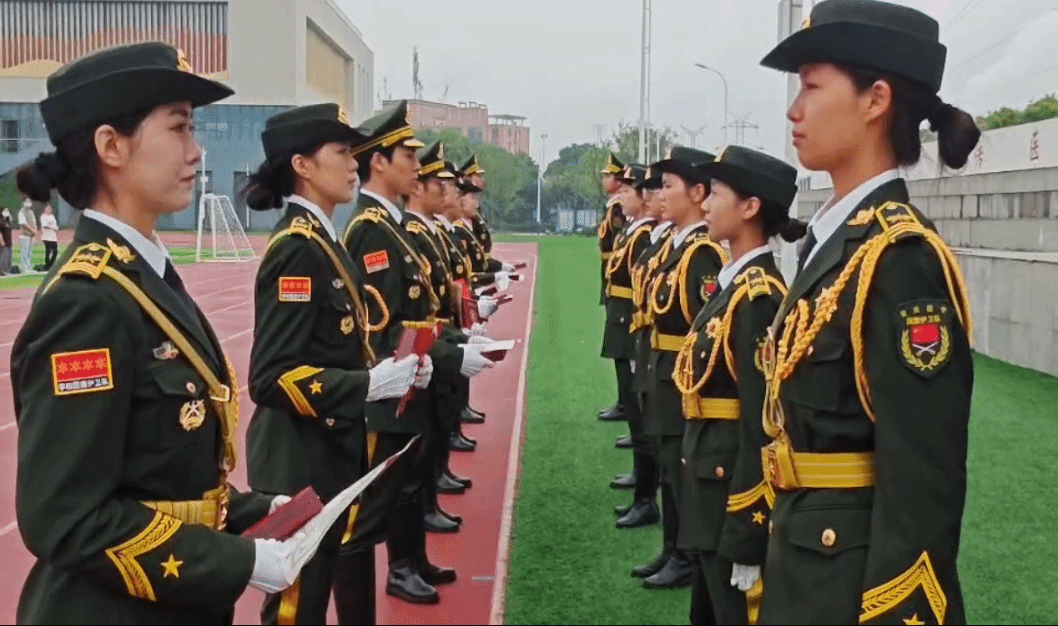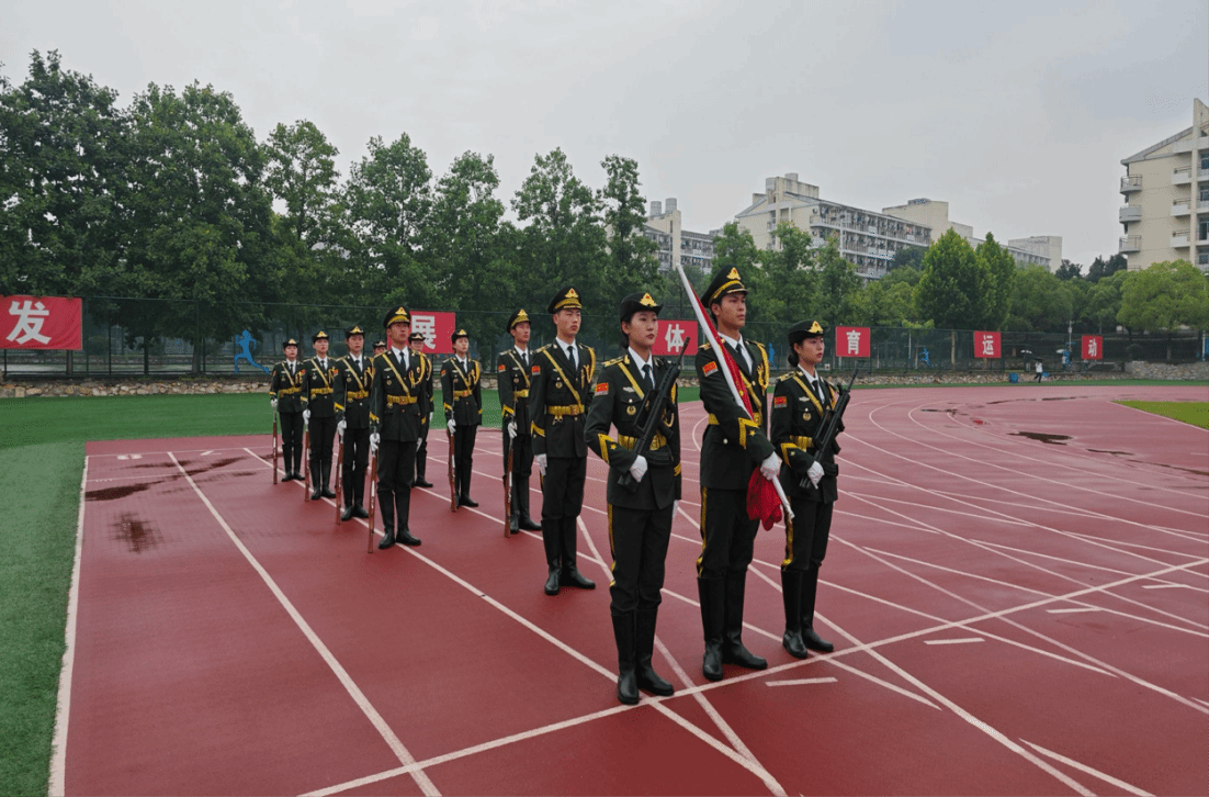 仪式开始,全体国旗护卫队队员喊着响亮的口号,踏着铿锵有力的步伐,昂首阔步来到操场,正步转齐步威武霸气,停止间转体干脆利落,一举一动俨然是标准的军人仪仗队的姿态,一身戎装英气逼人。