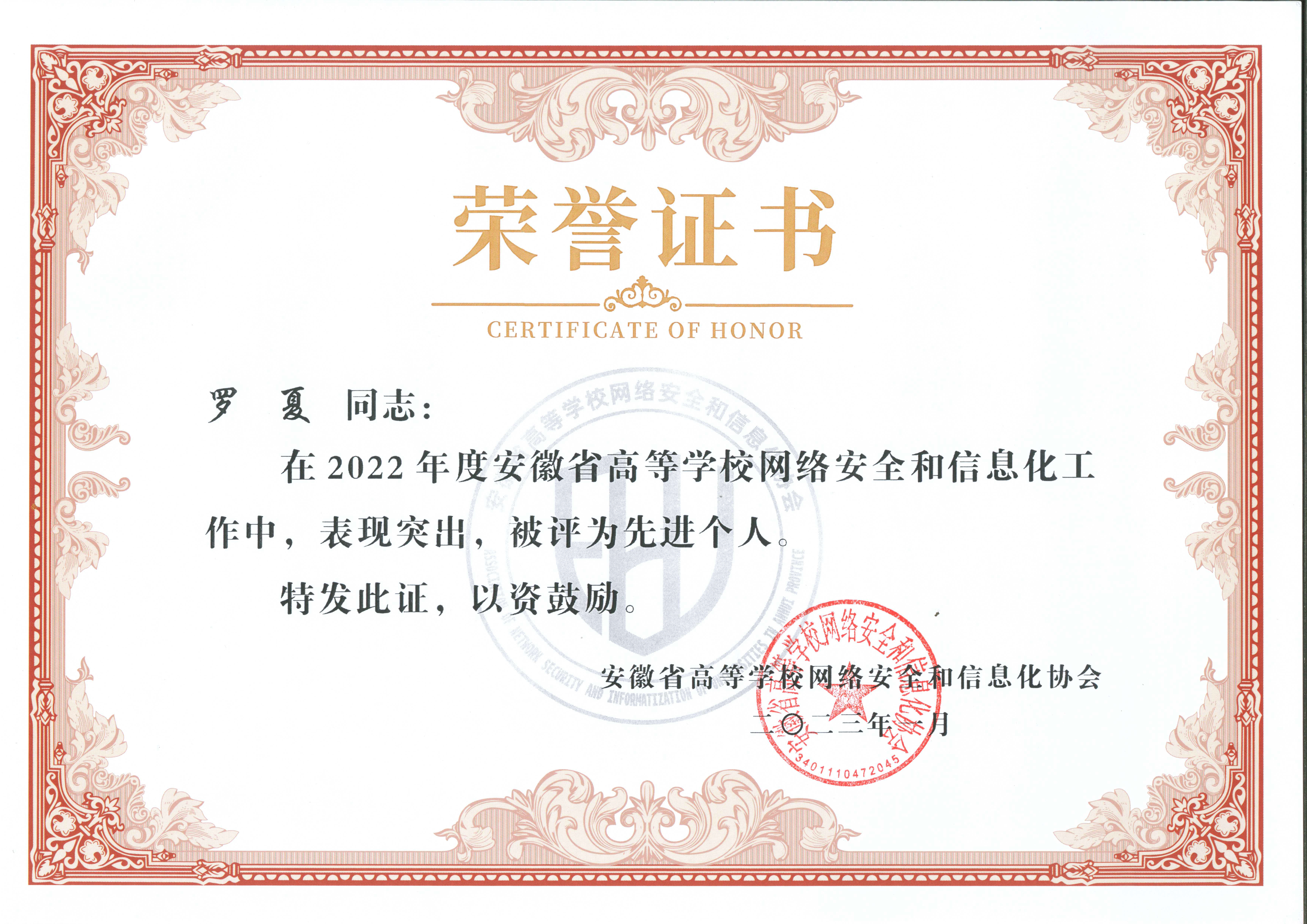最后,安徽省高等学校网信协会对2022年度先进集体、先进个人颁奖,我中心罗夏老师获“先进个人”荣誉称号。(撰文、供图:齐操俊,审改:尤伟)