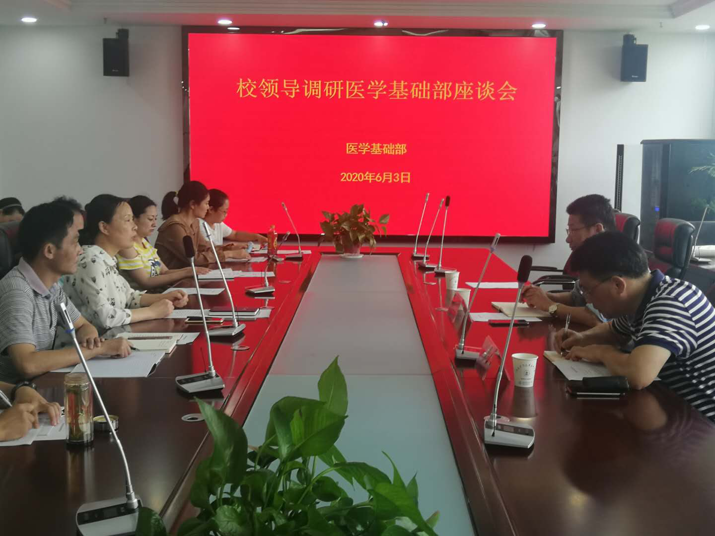 6月3日,姚文兵校长、朱庆丰副校长到医学基础部召开调研会议,医学基础部相关人员及教师代表参加座谈。