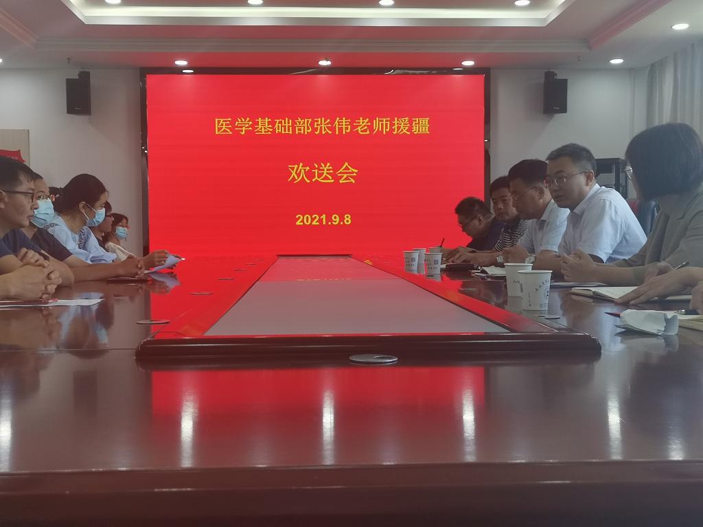 9月8日上午,医学基础部张伟老师援疆欢送会在图书馆6楼会议室举行。校党委委员、副校长朱庆丰,党委委员、组织人事处处长朱三九,教务处处长汪瑞,医学基础部主任李济平,直属党支部书记贺正皖,援疆教师张伟及医学基础部教师代表出席会议。会议由朱三九主持。