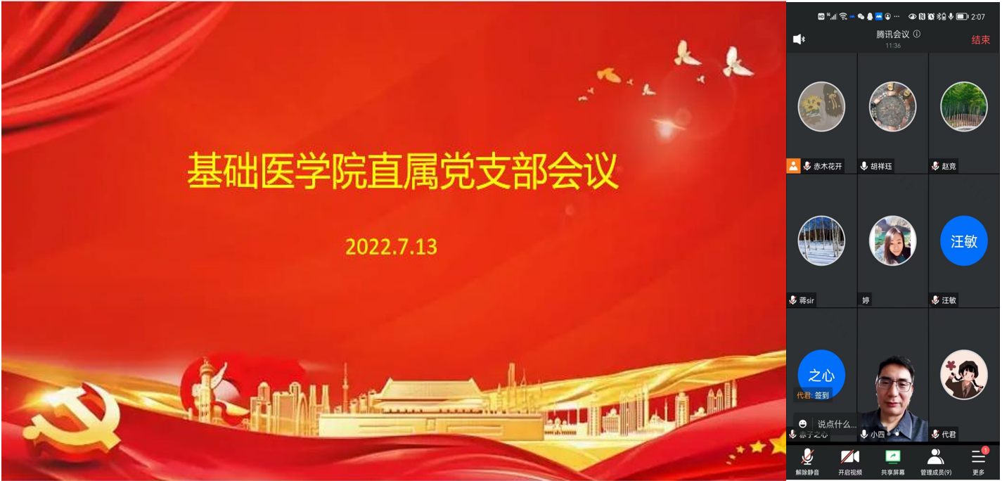 2022年7月13日下午2点,基础医学院直属党支部通过腾讯会议线上召开全体党员大会,对上半年党建工作进行总结,并完成对暑期工作的布置。会议由支部副书记杨小四主持,全体党员线上参会。