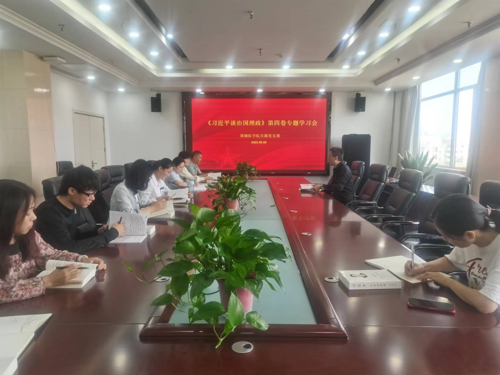 2022年9月28日中午,基础医学院直属党支部在图书馆六楼会议室开展《习近平谈治国理政》第四卷专题学习会。支部副书记杨小四领学,支部全体党员参加学习。