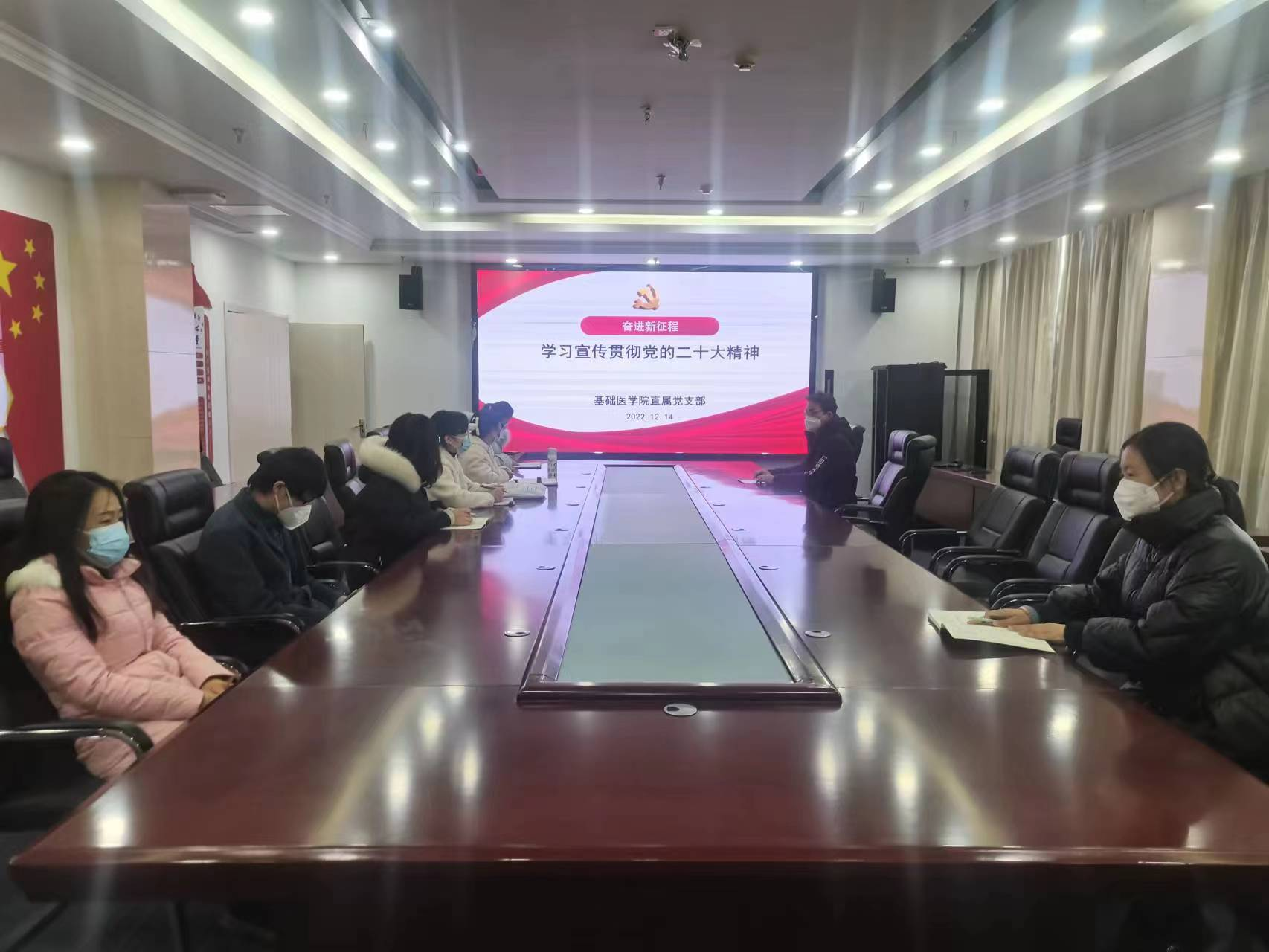 为深入学习宣传贯彻党的二十大精神,2022年12月14日下午,在图书馆六楼会议室,基础医学院直属党支部开展宣讲活动。活动由基础医学院直属支部副书记、副院长杨小四主持并宣讲,全体党员参加。