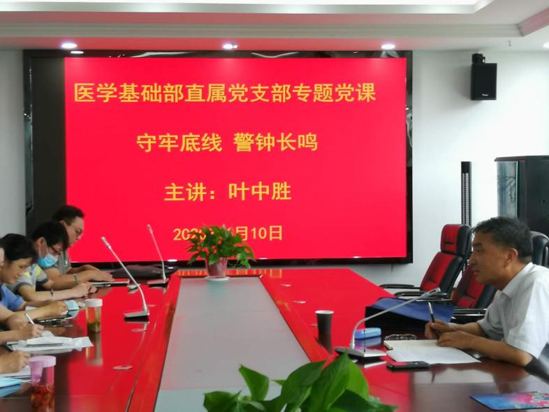 6月10日上午,根据学校党委“三个以案”警示教育工作安排,校党委委员、组织部长叶中胜以“守牢底线、警钟长鸣”为主题为医学基础部直属支部全体党员上专题党课。