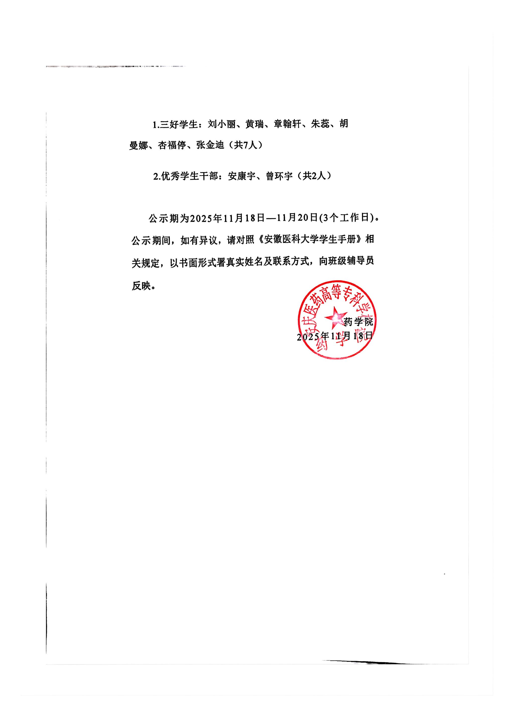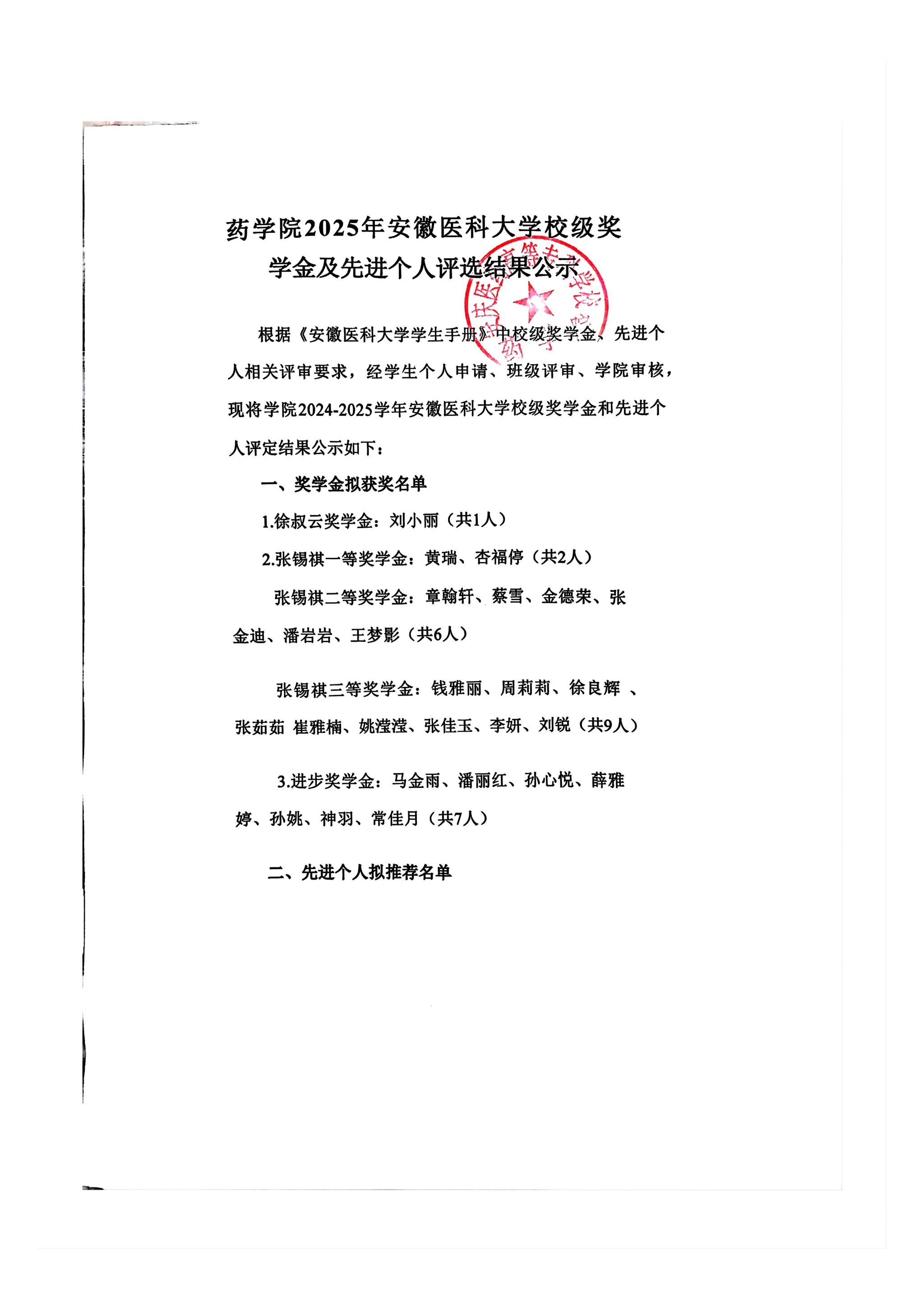 药学院2025年安徽医科大学校级奖学金及先进个人评选结果公示
