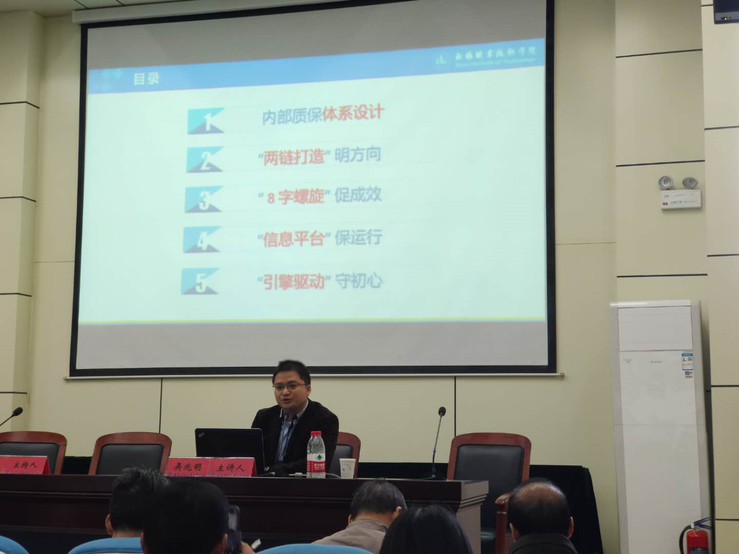 10月26日上午,无锡职业技术学院质量监督与控制部副主任吴兆明来我校就诊改工作进行交流讲座。期间,吴兆明主任从内部质保体系设计、两链打造、8字螺旋、信息平台建设、引擎驱动五个方面分享了无锡职业技术学院诊改的成功经验。