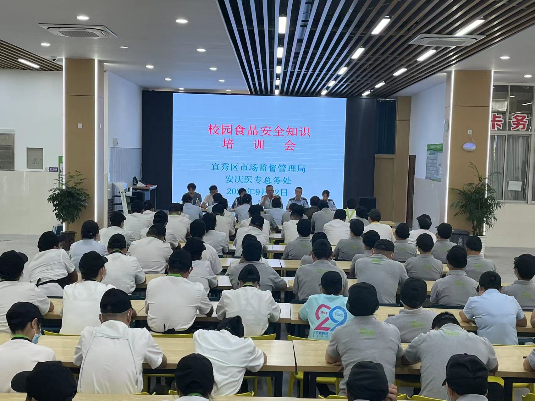 为了全面提升我校餐饮从业人员素质和能力,落实食品安全监管责任,建设让师生放心、满意的就餐环境,9月22日下午,安庆市宜秀区市场监督管理局大龙山市场监督管理所所长陈长春一行一楼食堂大厅开展了食品安全培训会,总务处管理人员、各食堂管理人员、食堂员工等近百人参加培训及考试。