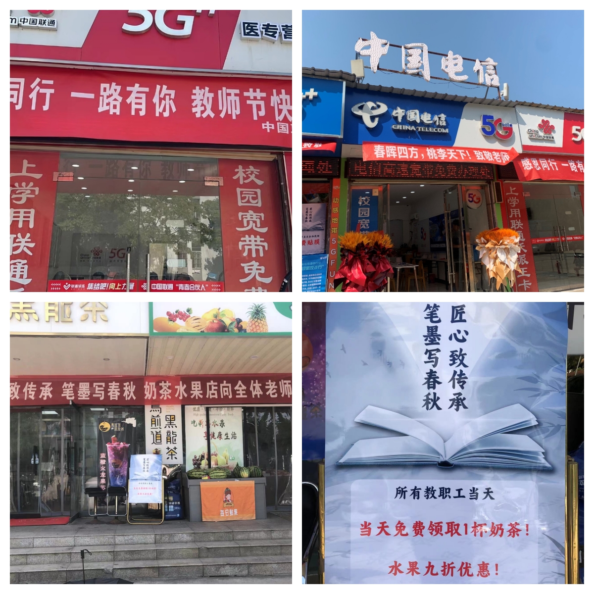 校园内各驻校后勤服务企业悬挂起“春晖四方,桃李天下!”、“老师您辛苦了”、“感恩同行,一路有你,教师节快乐”等条幅并开展了各类优惠活动,以表达尊师重教之情,烘托热烈节日氛围。