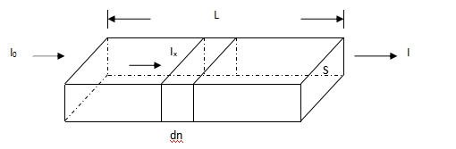(S-物体的截面积,l-厚度,n-吸光质点数,光通过此物体后,由于一些光子被吸收,光强从I0降低至I。)