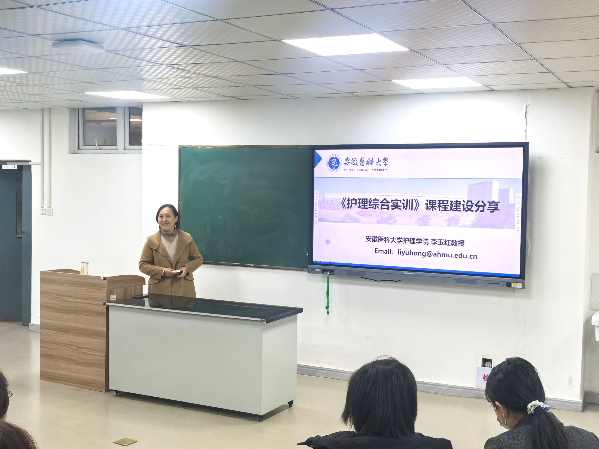 为进一步推进我校《护理综合实训》课程建设质量,提升护理专业实训教学水平,2025年12月10日中午,护理学院邀请安徽医科大学护理学院李玉红教授,分享她在《护理综合实训》课程建设经验。学院全体专业教师参会,共同聚焦实训课程创新与教学能力提升。