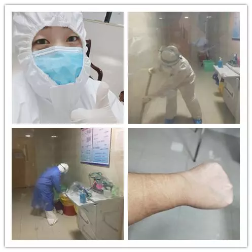 刚到发热病房的时候,我和队友们一起筹备病房,学习相关知识。护理部潘主任也总是来关心询问我们缺什么,适应得怎么样,每天都会嘱咐我们做好自我防护。领导们的重视和充分的前期培训让我对抗击疫情有了更强的信心。上岗第一天我主动申请上大夜班,第一次接触患者,说不担心是假的,当我穿着防护服推开门的一刹那,手有点抖,稍作镇定,克服了隔离衣和防护镜带来的不便,我顺利完成了第一个大夜班。虽然衣服湿了又干,干了又湿,手被手套和消毒液浸泡得发白,但看到病人满意的微笑,我也得到了满足。病毒会被隔离直至消灭,但是爱不会被隔离在防护服之外。