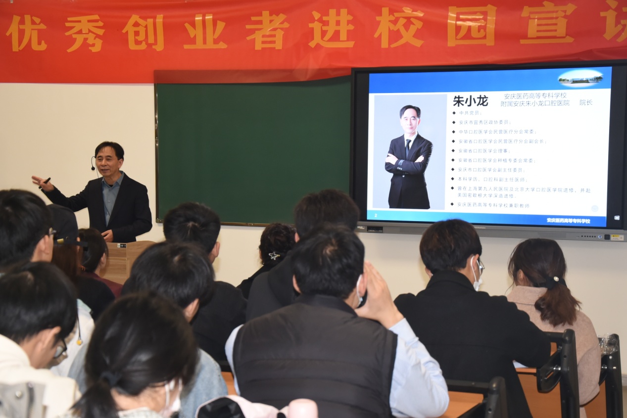 宣讲会上,朱小龙从个人创业史、医院发展史等方面分享了自己的心路历程和成功经验。他还分析了口腔医疗行业的发展前景,解答了护理专业在口腔行业的就业岗位,引导同学们深刻认识创新创业的意义,倡导大家要培养正确的就业认知。他热情洋溢的宣讲获得了在座师生们的高度认可。