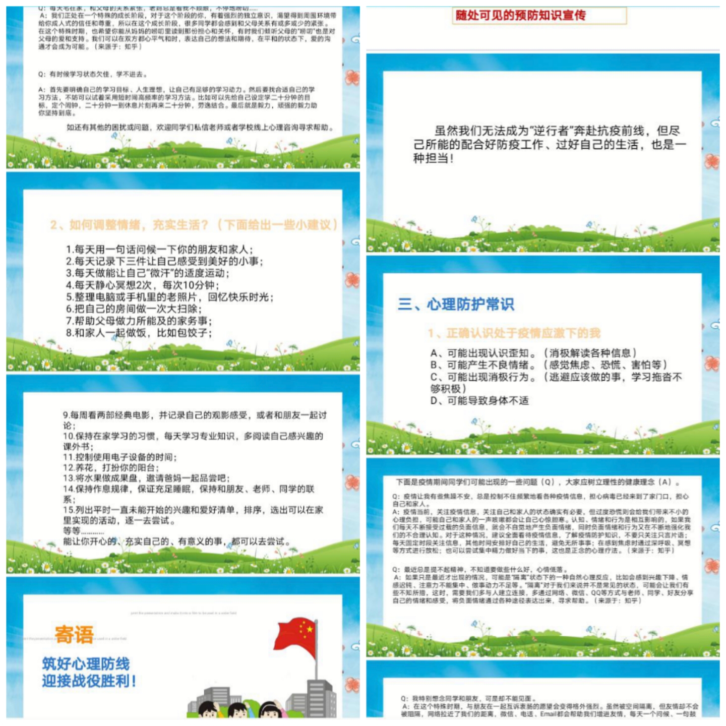 在整个心理健康月活动中,系心理辅导站组织班级心理委员在班级普及心理健康知识,进宿舍和同学线下沟通,了解学生心理上困惑焦虑问题尽力解决或向上反馈;组织辅导员在班群中与学生积极互动,了解学生困难,积极应对疫情可能造成的心理影响,学会以积极乐观的态度面对困境;辅导站还积极关注求职困难、家庭困难、近期受挫的学生,通过网络渠道开展谈心谈话,引导学生自觉学习心理调适的方法,学会正确认识自我,让学生在疫情下学会如何调节情绪和应对心理压力。