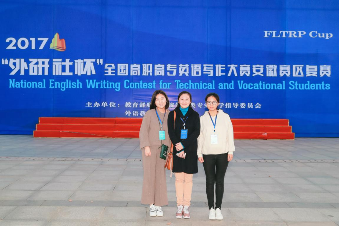 赵婷老师(中)与第八届“外研社杯”全国高职高专英语写作大赛本校参赛选手合影