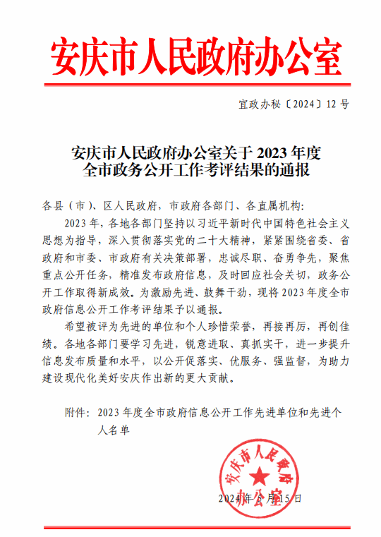 近日,安庆市人民政府办公室通报了2023年度全市政务公开工作考评结果,我校获评全市政务公开工作先进单位,党政办陈贵萍同志荣获“先进个人”荣誉称号。