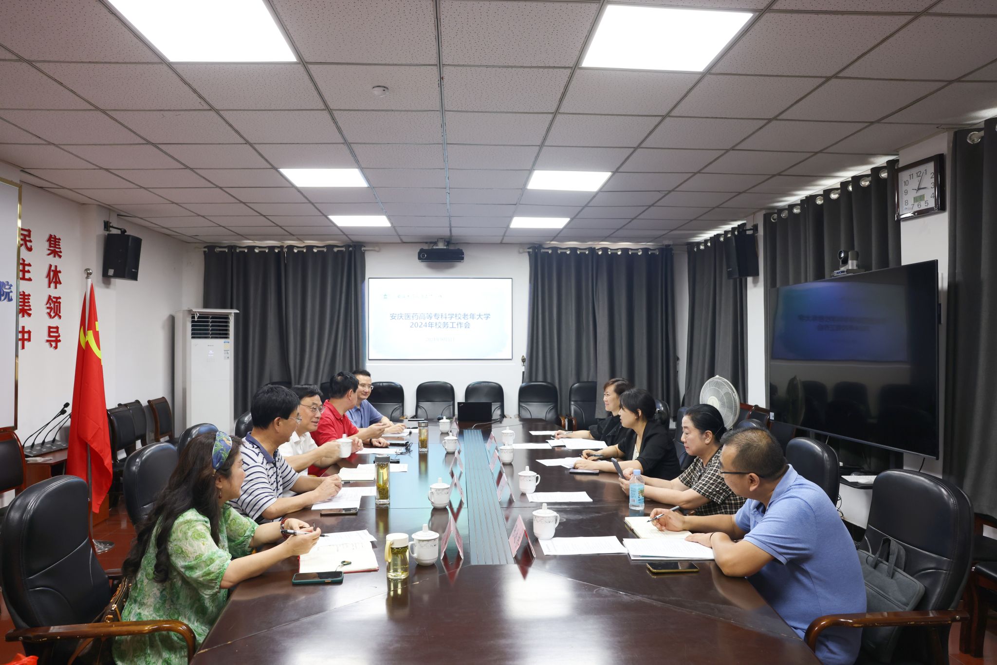 为进一步统一思想,凝聚力量,谋划好新学期各项工作安排,2024年9月5日下午,校老年大学召开2024年秋季学期校务工作会议。校党委副书记、校长朱庆丰出席会议,安庆一一六医院、安庆市中医医院及校本部相关负责同志参会。会议由校老年大学常务副校长李少军主持。