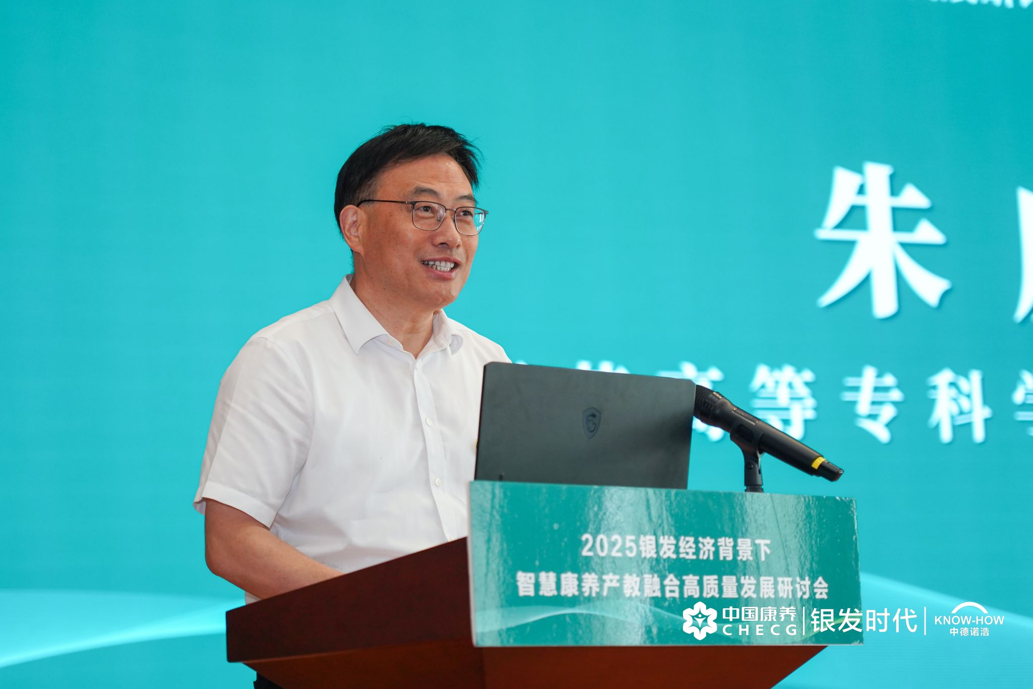 朱庆丰致欢迎词。在致辞中,他向参会的领导、专家学者、行业同仁表示了欢迎并简要介绍了我校联合中国健康养老集团启动“中康养产业学院”项目建设运营情况,他表示安庆医药高等专科学校将与各界同仁携手并进,共同书写产教融合的“奋进之笔”,培育智慧康养的“栋梁之材”,为构建老年友好型社会贡献职教力量。