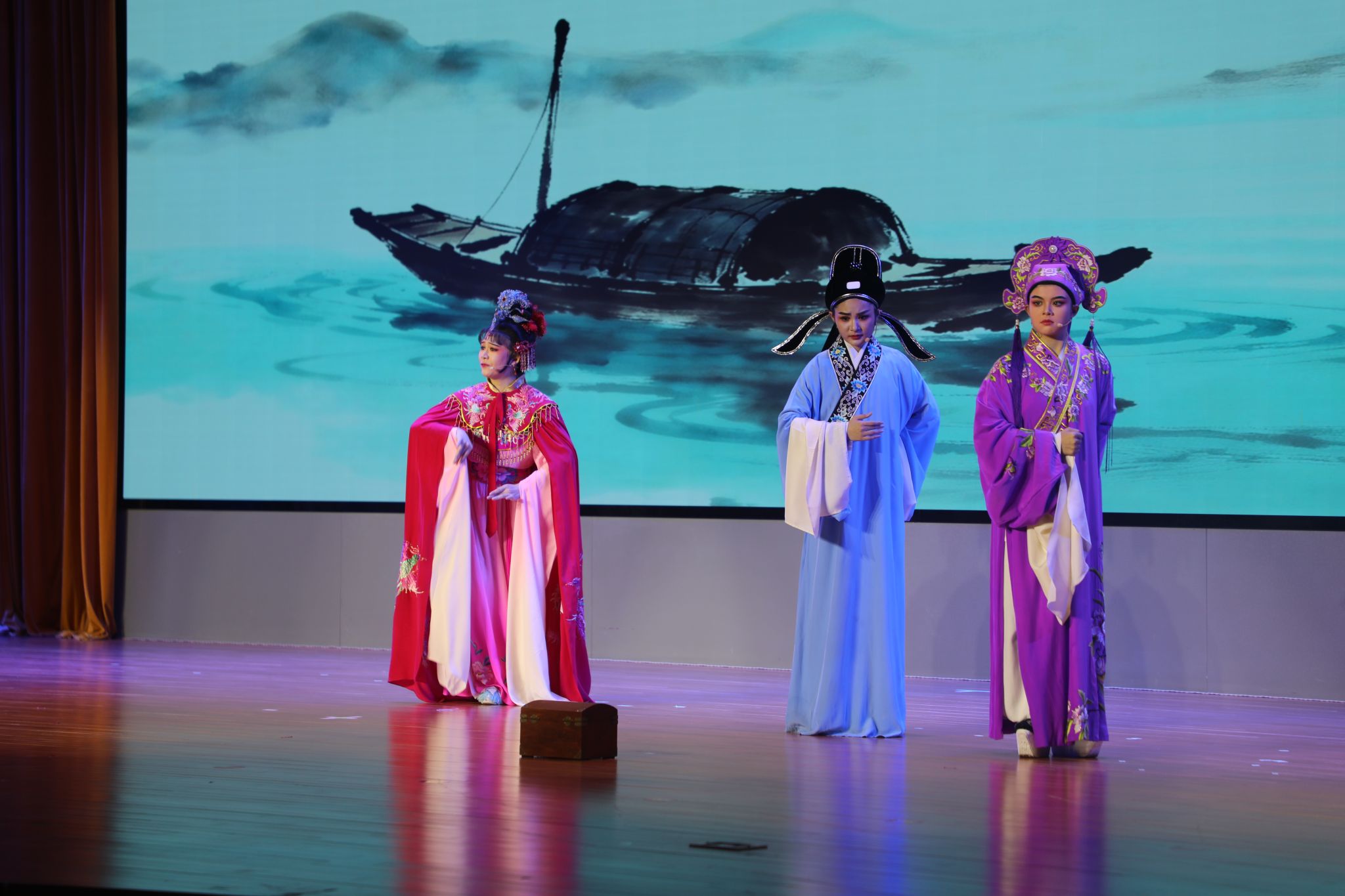 作为越剧诗意美学的巅峰之作,《葬花》让不少师生深刻体会到传统戏曲独特的抒情张力。演员以婉转细腻的唱腔,搭配荷锄葬花的身段表演给观众留下了深刻的印象。此外,还有师生耳熟能详的《孔雀东南飞》、《窦娥冤》等曲目一一上演,课本中的知识在越剧中再次重现,却有着新的视觉感受。《道观情缘・偷诗》等曲目则充满诗意与情趣,轻松活泼的剧情让师生们沉醉其中、笑意连连。演出尾声,特色技艺《水袖表演》则瞬间将现场气氛推向最高潮,水袖舞动间“翩若惊鸿、婉若游龙”的灵动之美展现得淋漓尽致,赢得满堂喝彩。整场演出期间,百花亭报告厅座无虚席,氛围热烈。师生们全神贯注,目光紧紧追随舞台,时而为剧情的跌宕起伏屏息凝神,时而为演员的精湛技艺热烈鼓掌,传统艺术与青年学子之间形成了强烈的情感共鸣,现场掌声与赞叹声此起彼伏。