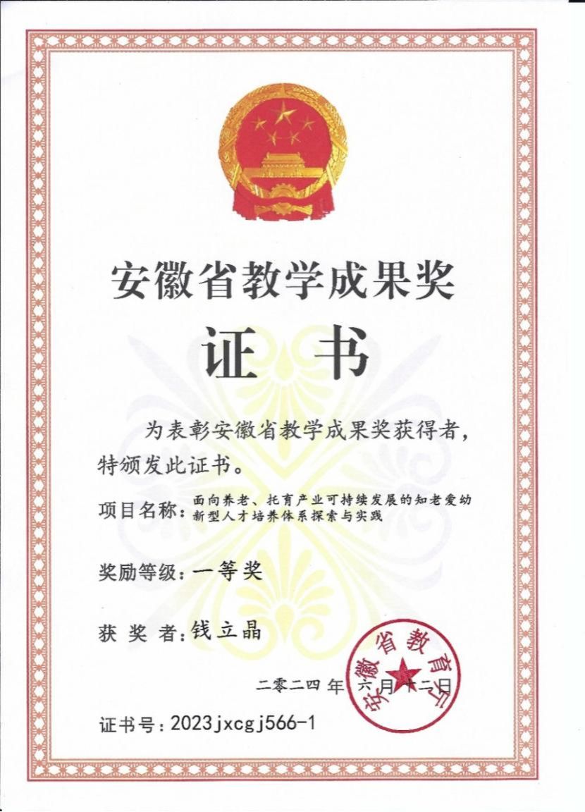 在人才培养模式改革中,产业学院率先探索“课证赛创” 融通的课程体系,将创新创业教育理念深度融入专业教学,把职业资格标准、竞赛评价规范与产业前沿技术同步引入课堂。通过修订《老年保健与管理专业人才培养方案》,推行项目化教学,让学生在老年康乐活动策划、适老化产品设计等实践中锤炼本领。同时,组建由校内教师与企业高管、技术骨干组成的“双导师”团队,形成“企业出题、师生解题、竞赛验证”的协同育人机制,2024 年以来已聘任 10 余名企业创新创业导师,指导各类竞赛项目 20 余项。护理学院钱立晶老师主持的《面向养老、托育产业可持续发展的知老爱幼新型人才培养体系探索与实践》项目获得2023年安徽省教学成果一等奖。