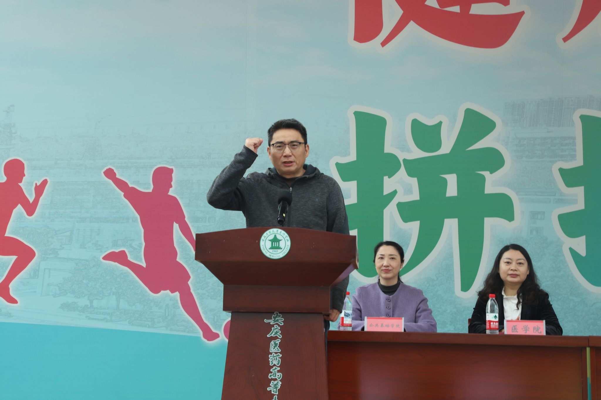 在庄严的升国旗、奏唱国歌仪式后,校党委副书记、校长朱庆丰致开幕辞并宣布运动会开幕。他代表学校向运动会的顺利召开表示热烈祝贺,向全体运动员、裁判员及筹备工作人员致以诚挚问候。他指出,体育是立德树人的重要载体,是锤炼意志、强健体魄、凝聚力量的有效途径。希望全体运动员奋勇争先、严守规则,赛出水平、赛出风格;全体裁判员公平公正、严谨执裁;全体工作人员细致服务、全力保障。他号召全体师生以本次运动会为契机,积极践行“日行万步,健康一生”理念,把体育精神融入学习工作与行医济世之中,为守护人民健康、建设健康中国贡献青春力量。