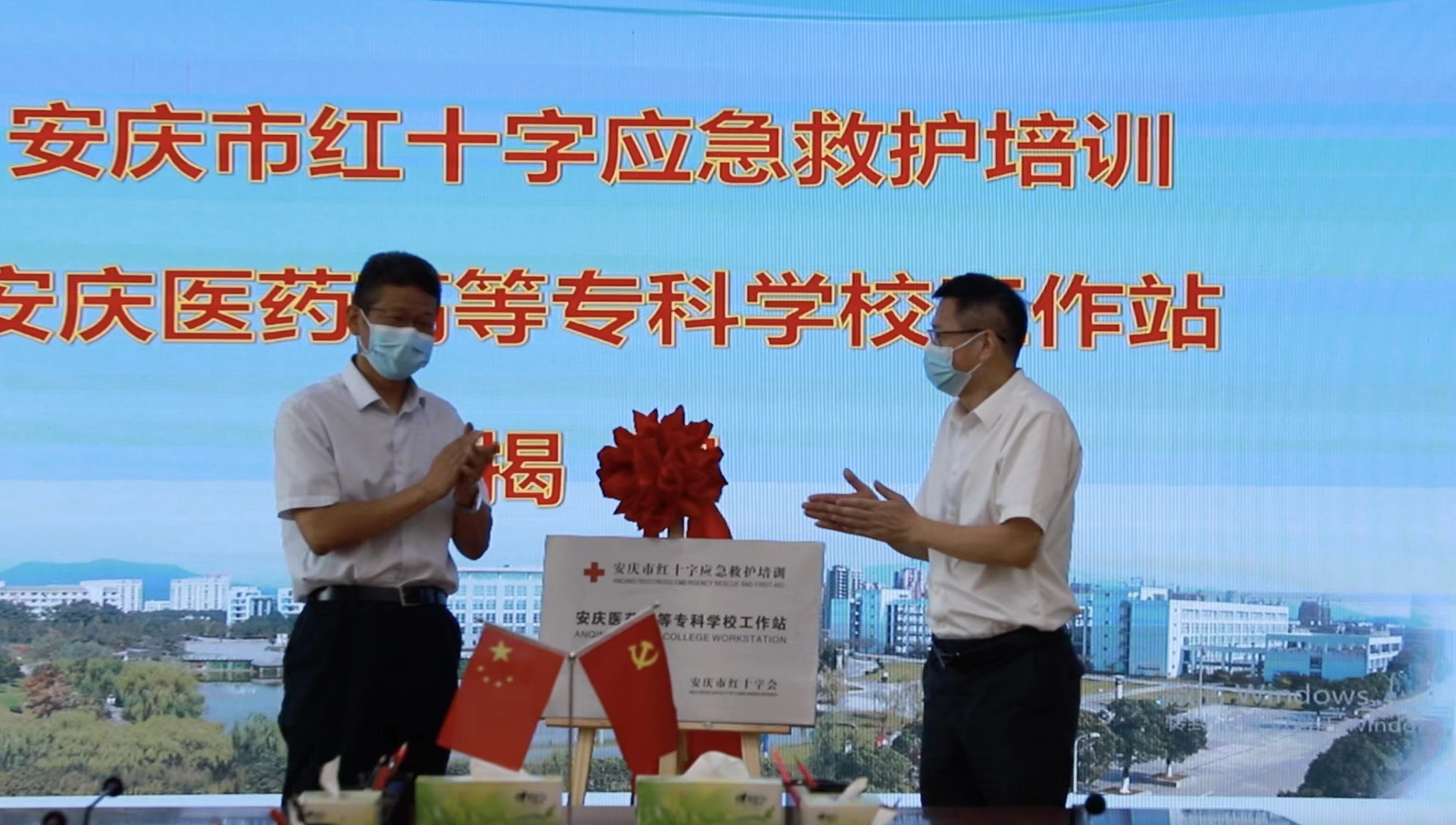 9月7日上午, 我校举行安庆市红十字应急救护安庆医药高等专科学校工作站揭牌仪式。安庆市红十字会党组书记、专职副会长陈滨,校党委副书记、校长姚文兵共同为工作站揭牌。仪式由党委委员、办公室主任朱雯主持。