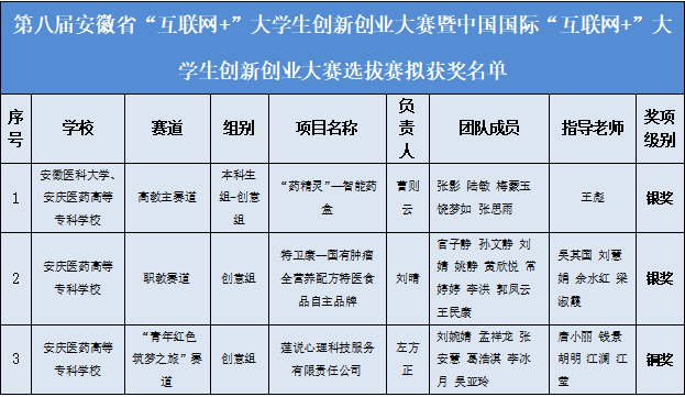 9月15日, 由安徽省教育厅与合肥市人民政府联合主办,合肥工业大学、合肥学院、合肥职业技术学院、安徽财贸职业学院和合肥市教育局共同承办的第八届安徽省“互联网+”大学生创新创业大赛暨中国国际“互联网+”大学生创新创业大赛选拔赛已圆满结束。大赛经专家网评、线上分组赛和线上极速路演等环节,我校参赛项目获安徽省银奖2项,铜奖1项。