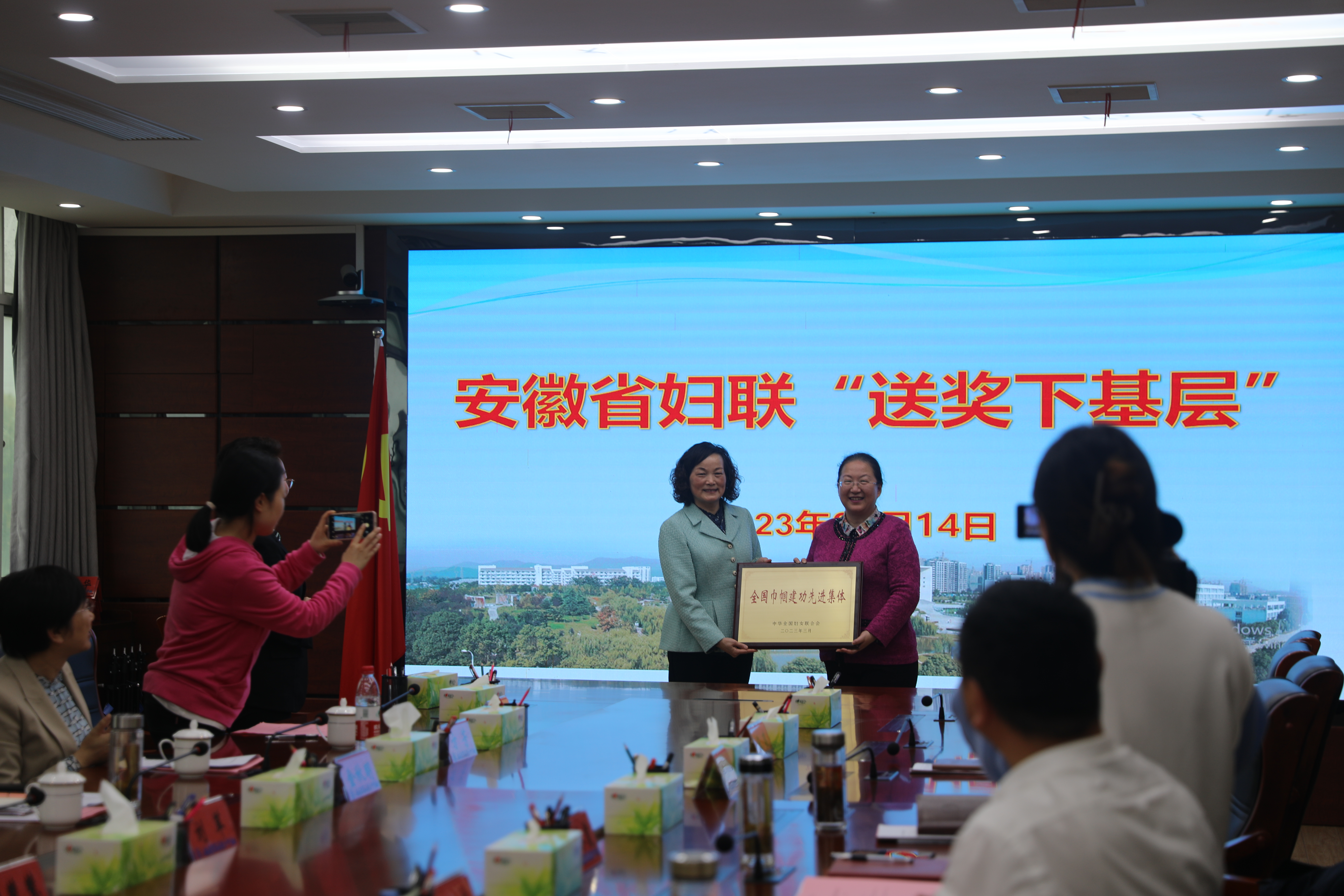 4月14日下午,安徽省妇联党组书记、主席刘苹一行在安庆市妇联党组书记、主席金秋明等陪同下,莅临我校开展“全国巾帼建功先进集体”送奖下基层活动,校党委书记叶林霞代表学校接受“全国巾帼建功先进集体”荣誉奖牌。学校党委班子成员和女教职工代表参加活动。