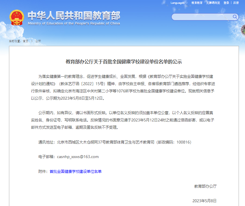 近日,教育部公布了首批全国健康学校建设单位的公示名单,我校拟确定为首批全国健康学校建设单位。