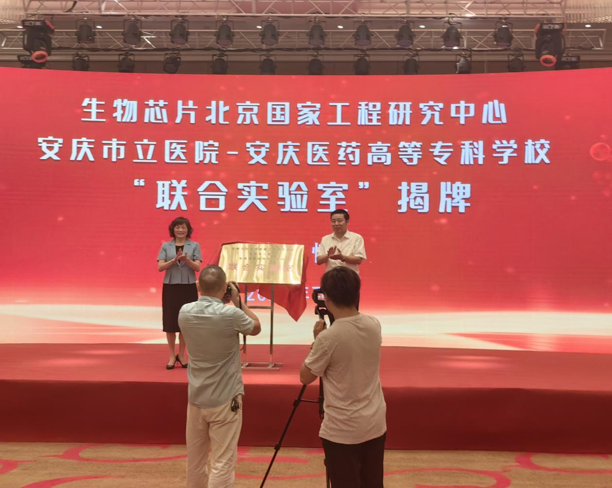 7月3日上午,安庆市首个精准医学中心揭牌运营活动在怀宁县举行。副市长王赵春出席仪式,并与清华大学医学院医学系统生物学研究中心教授、研究员、生物芯片北京国家工程研究中心常务副主任邢婉丽共同为安庆市精准医学中心揭牌。活动由怀宁县委书记余学峰主持,安庆市卫健委员党组书记、主任潘结标到会致辞。此次活动上,我校党委书记叶林霞与市立医院副书记、院长刘建共同为我校与生物芯片北京国家工程研究中心、安庆市立医院共建的联合实验室揭牌。