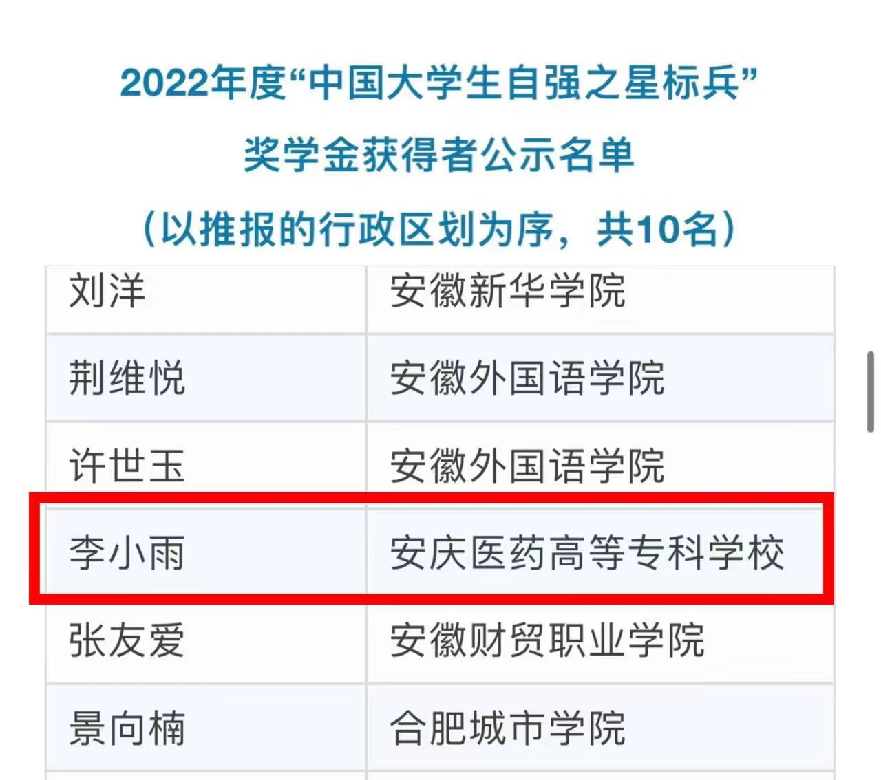 近日,由共青团中央、全国学联指导,中国青年报社、新东方教育科技集团、中国青年创业就业基金会联合举办的2022年度“中国大学生自强之星”评选结果揭晓。经学校推荐、省级初评、全国评审等环节,我校药学院2021级药学专业李小雨同学荣获2022年度“中国大学生自强之星”奖学金,近年来我校已有五名学生先后获此殊荣。