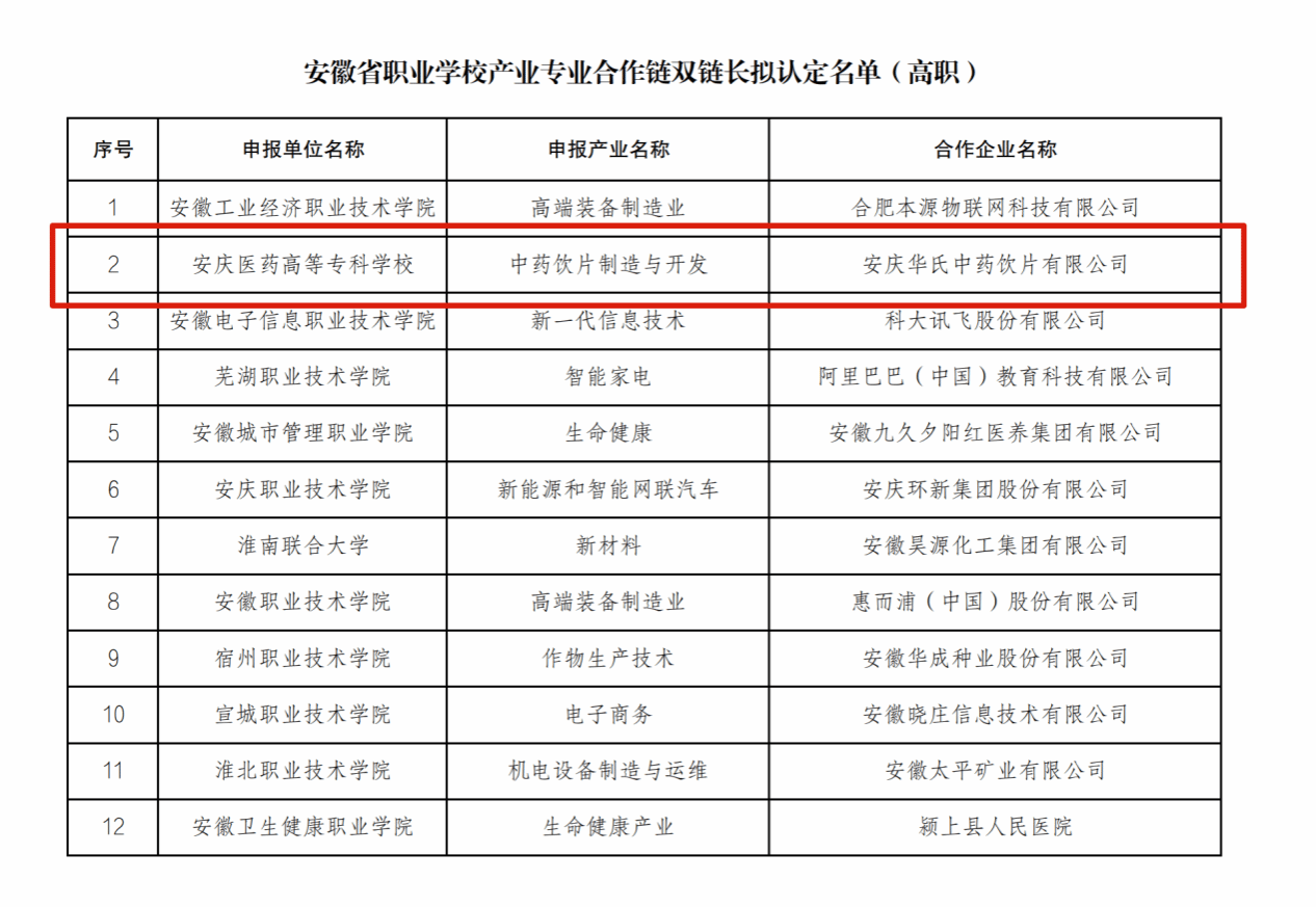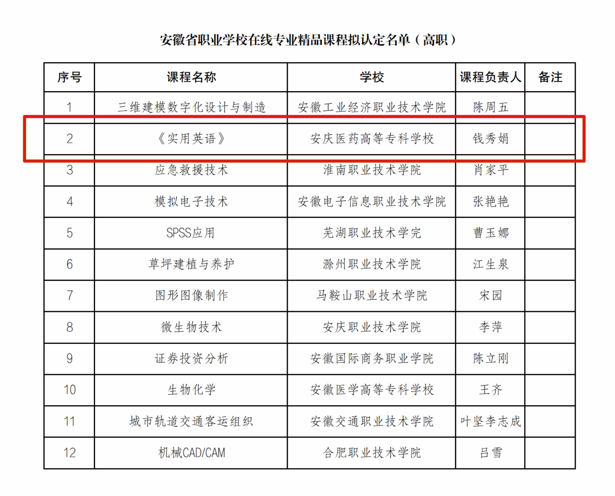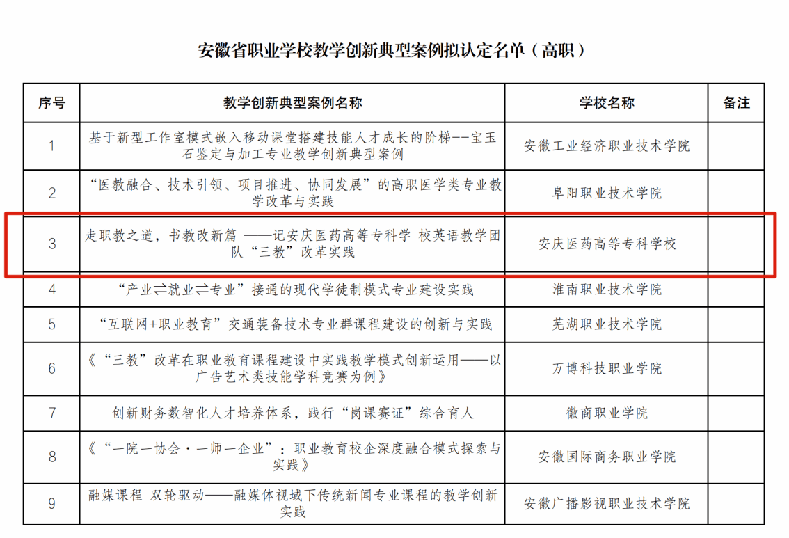 近日,安徽省教育厅印发《关于“六百工程”首批评审结果的公示》,安庆医药高等专科学校《走职教之道,书教改新篇——记安庆医药高等专科学校英语教学团队“三教”改革实践》入选教学创新典型案例;“中药饮品制造与开发产业入选”入选产业专业合作链双链长;《实用英语》入选在线专业精品课程。