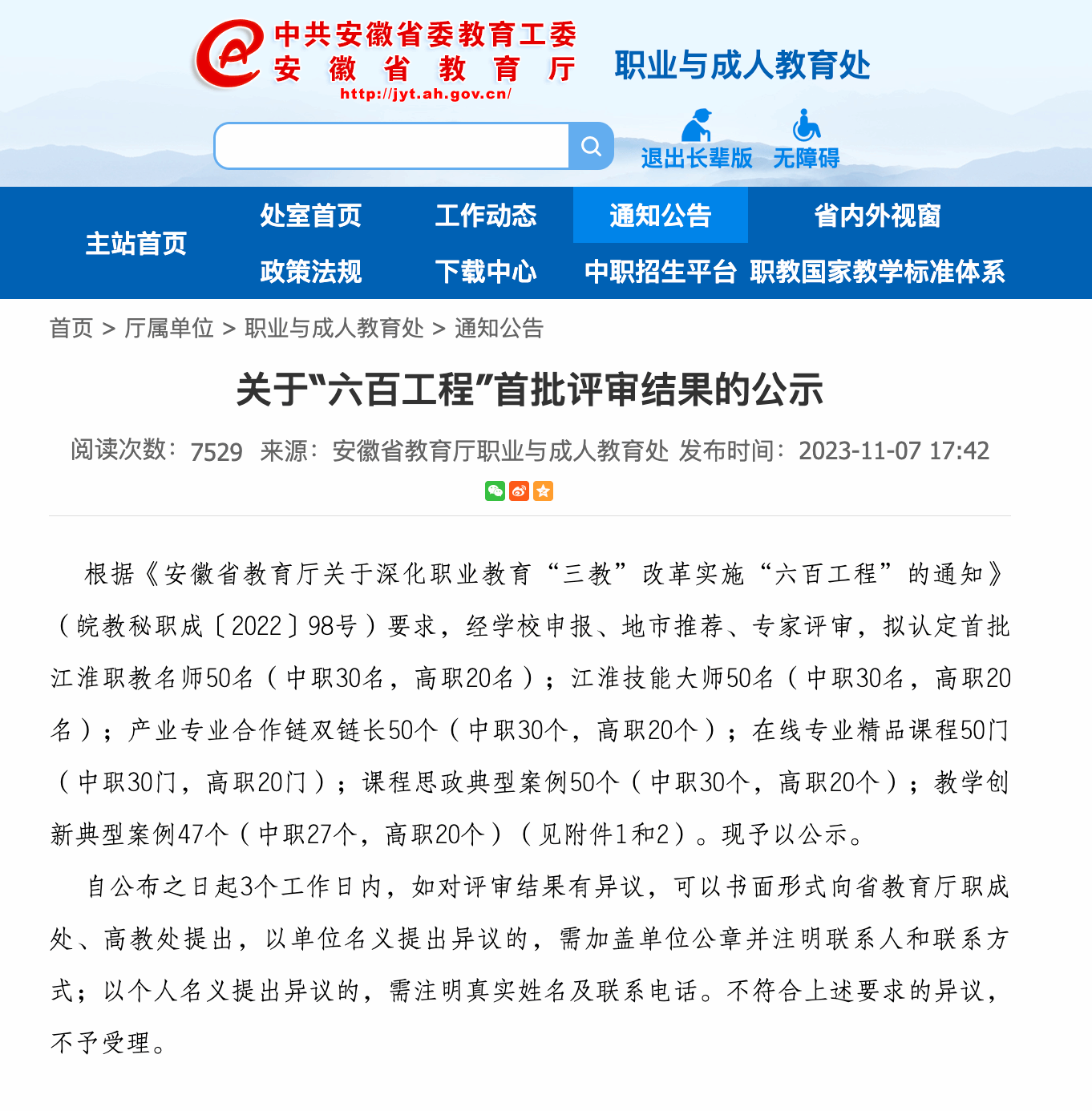 根据《安徽省教育厅关于深化职业教育“三教”改革实施“六百工程”的通知》(皖教秘职成〔2022〕98号)要求,本次评选经学校申报、地市推荐、专家评审,拟认定首批江淮职教名师50名(中职30名,高职20名);江淮技能大师50名(中职30名,高职20名);产业专业合作链双链长50个(中职30个,高职20个);在线专业精品课程50门(中职30门,高职20门);课程思政典型案例50个(中职30个,高职20个);教学创新典型案例47个(中职27个,高职20个)。