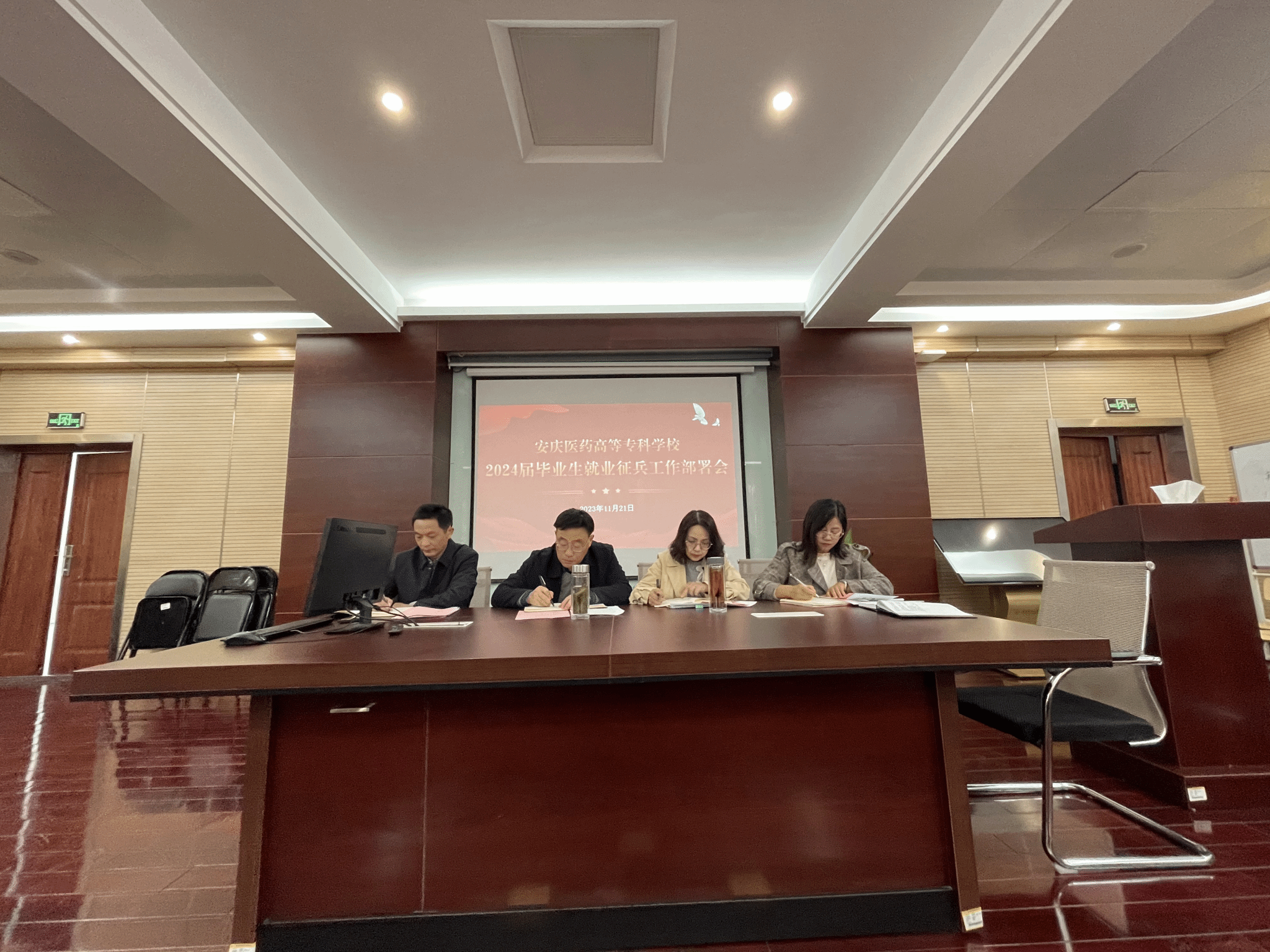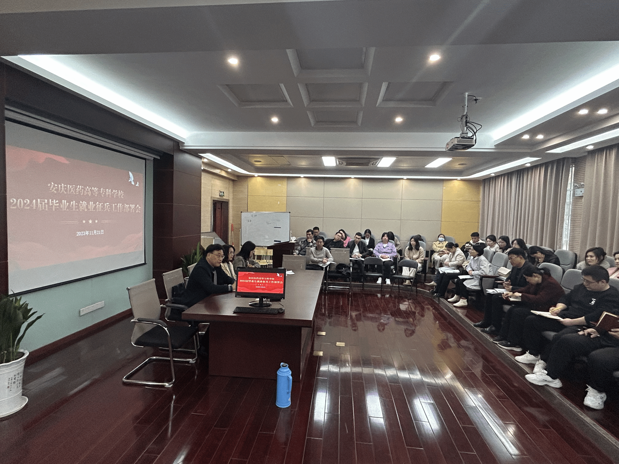 11月21日,我校在药学院实训楼会议室召开2024届毕业生就业征兵工作部署会。校党委副书记、校长朱庆丰,党委委员陈琪、刘毅出席会议,学生处、团委负责人,各二级学院学院党总支书记、副书记、相关工作人员,2024届全体毕业班辅导员及2023届部分毕业班辅导员参加,会议由陈琪主持。
