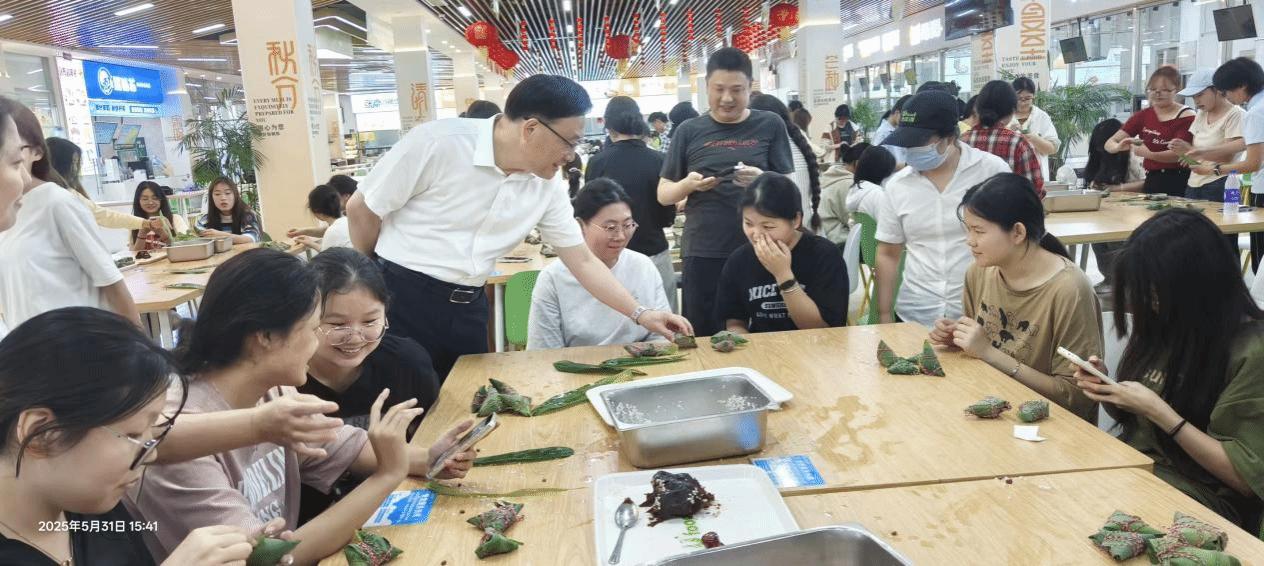 活动伊始,来自我校全国各地的学生制作了不同风味的粽子, 如南方蜜枣甜粽、北方蛋黄咸粽等,这既是对一场美食文化之旅,也是一次对传统文化内涵的学习。活动现场校长朱庆丰与学生热情地互动交流,亲手指导同学们折粽叶、填糯米、捆扎等技巧,共同体验传统美食制作的乐趣。现场气氛热烈而温馨,同学们互相交流着各自家乡的端午习俗和包粽子的心得,欢声笑语此起彼伏。