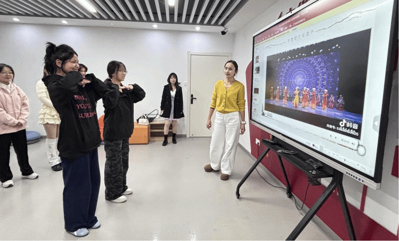活动现场,新疆中职班学生以一曲十二木卡姆经典选段开场,将南疆木卡姆的韵律之美展现得淋漓尽致。大专班学生则以黄梅戏选段回应,婉转的唱腔与灵动的身段赢得阵阵掌声。随后,两地学生结对互动,新疆学生指导大专班同学学习十二木卡姆的舞蹈步伐,大专班学生则耐心纠正黄梅戏的发音与手势,现场笑声与喝彩声不断。