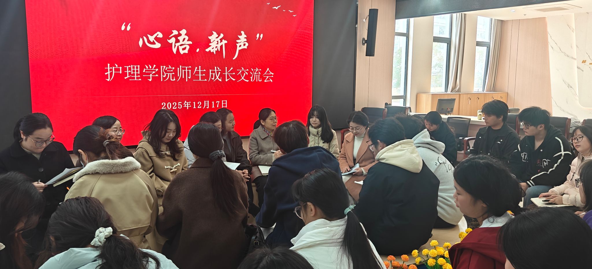 为深入贯彻落实“以学生为中心”的育人理念,进一步贴近学生、倾听心声,推动学院教育教学与服务管理提质增效,12月17日中午,护理学院党总支在大学生活动中心组织召开了“心语·新声”师生交流会。学院党总支书记、院长钱立晶,学院党政班子成员,各支部书记,教研室主任,三级机构负责人和在校班级学生代表围坐在一起,共叙成长话题。
