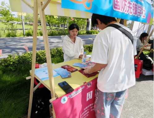 我校国防先锋学社的摊位前,醒目的红色展板与主题旗帜格外亮眼。展板上清晰介绍了社团“爱国、拥军、团结、好学”的宗旨,以及征兵宣传、国防教育、军事训练、国旗护卫队风采展示等核心工作,吸引了不少同学驻足了解。社员们现场发放宣传手册,耐心讲解国防知识与征兵政策,用互动交流传递青年学子的家国情怀。