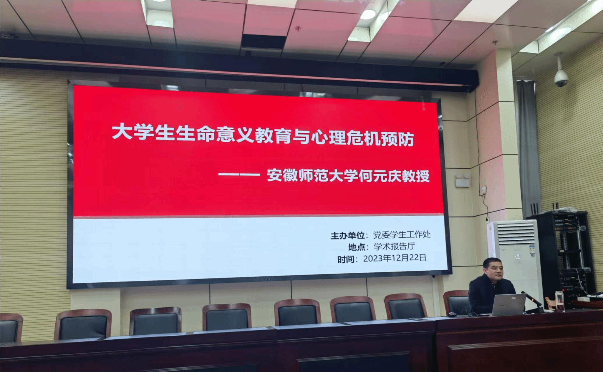 12月22日中午,学生处大学生心理健康教育与咨询中心邀请安徽师范大学何元庆教授来校,开展以《大学生生命意义教育与心理危机预防》为主题的专题心理讲座。讲座由钱景老师主持,在校班级心理健康委员、专兼职辅导员及校言心心理社团同学等共计200余名在学术报告厅听取了讲座。