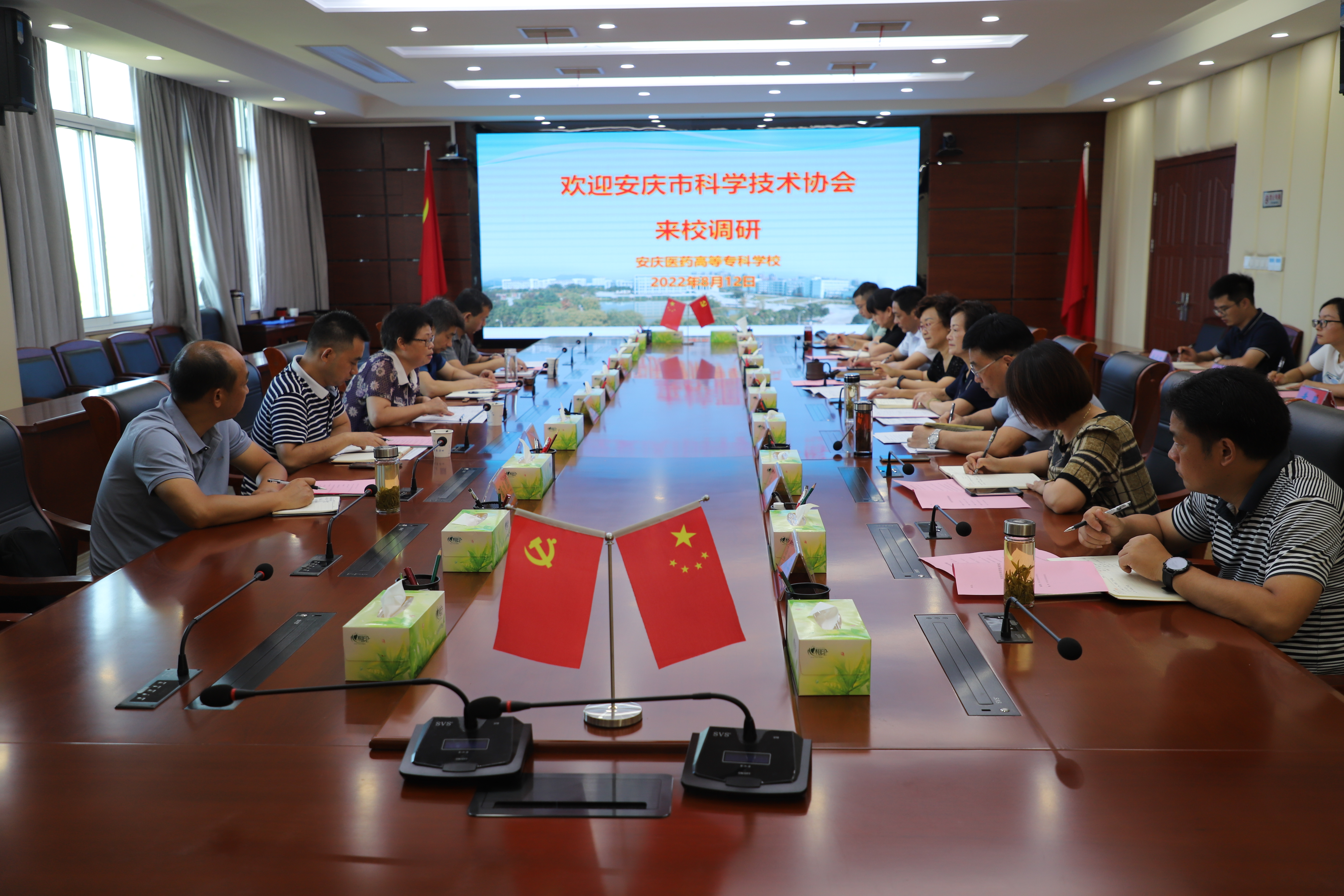 8月12日上午,安徽省政协委员、安庆市科学技术协会主席洪爱敏率科协副主席琚高祥、迎江区科协主席周逸群、迎江区教体局局长施爱国等一行五人来校调研交流。校党委书记叶林霞率校科协主席、副校长朱庆丰、党委委员朱雯、刘毅以及相关部门负责同志接待了洪爱敏一行。