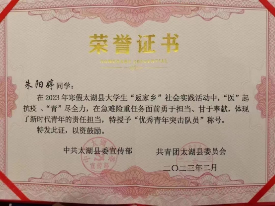 “团员青年请出列”——为助力新冠疫情防控平稳转段,今年1月,团安庆市委在全市范围内发出青年志愿者招募令,我校安庆籍学子——医学检验技术专业朱阳婷、护理专业张小娟同学第一时间响应号召,分别报名参加宿松县、太湖县专业型青年突击队,用自身所学专业知识协助基层医务人员,全力保障家乡人民群众度过一个平和圆满的春节。