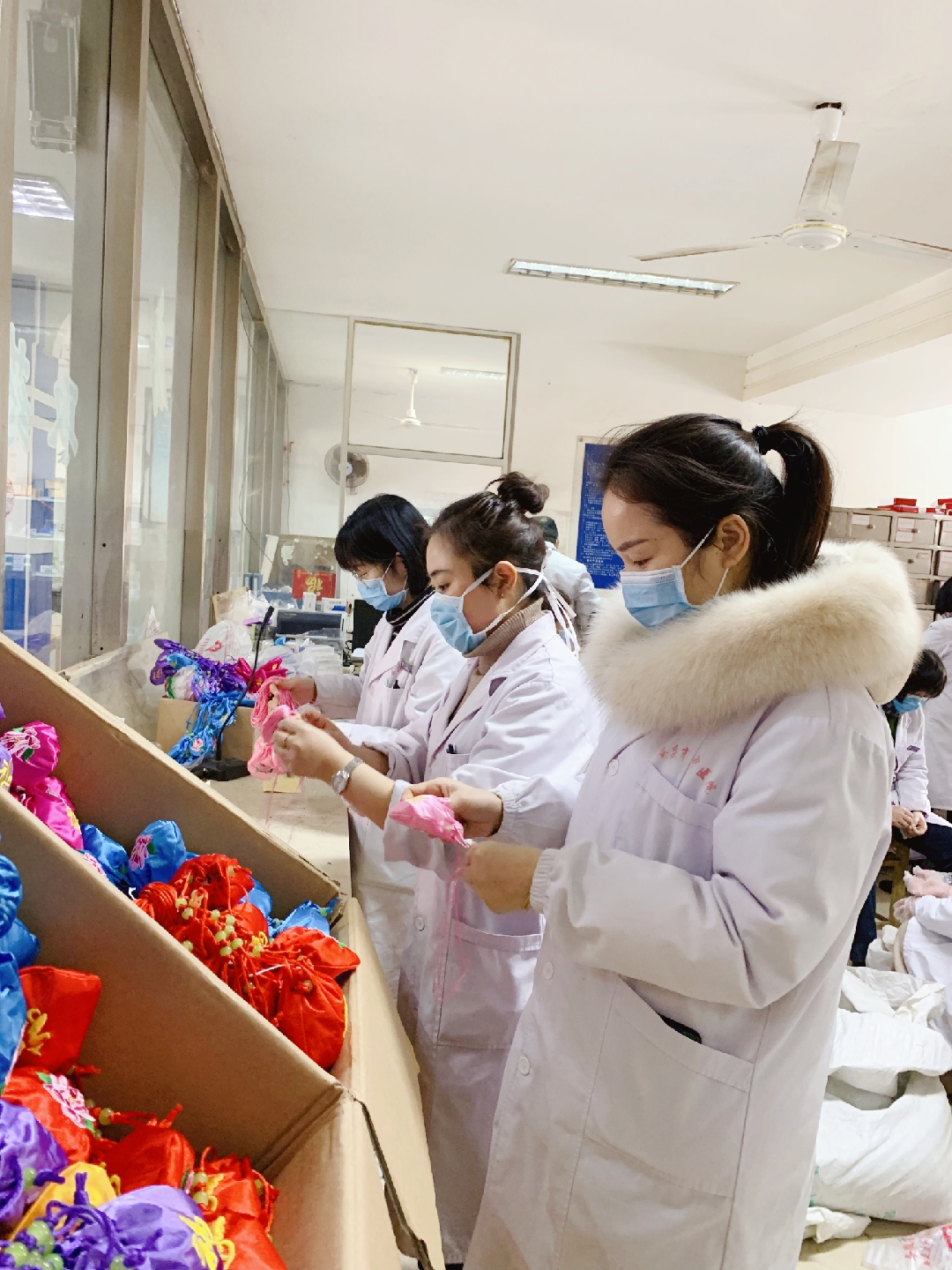 中医药是祖国的文化瑰宝,是中华民族传统文化的智慧结晶,有着数千年抗击瘟疫的丰富经验,千百年来以其独具特色的文化理念和治疗手段守护着亿万炎黄子孙的安康。中医强调“正气存内、邪不可干”,任何疾病都是人体免疫力和致病因素相互作用的结果,增强体质、提高免疫力就可以更好地避免疾病的发生。中医认为,此次疫情其病邪多与寒湿毒相关,防治的重点在益气、化湿、散寒、解毒。直属附院根据国家出台的《新型冠状病毒感染的肺炎诊疗方案》有关规范,组织院内多名临床经验丰富的中医专家进行了多次讨论,确定出中药茶饮、香囊、足浴方、艾灸等一系列具有中医特色的防疫方案。苍术、黄芪、防风、艾叶、苏叶、公丁香等药材统一调配到位,一批批香囊包装多处搜索货源加紧购买,全院各岗位人员全力支持共同协作,加班加点赶制香囊和茶饮。院内艾烟袅绕、香囊陈列,还贴心的为市民设置了中药茶饮免费饮用处,中医药文化和特色优势在医院里得到了彰显,中医药独特魅力在疫情防控中精彩展现。