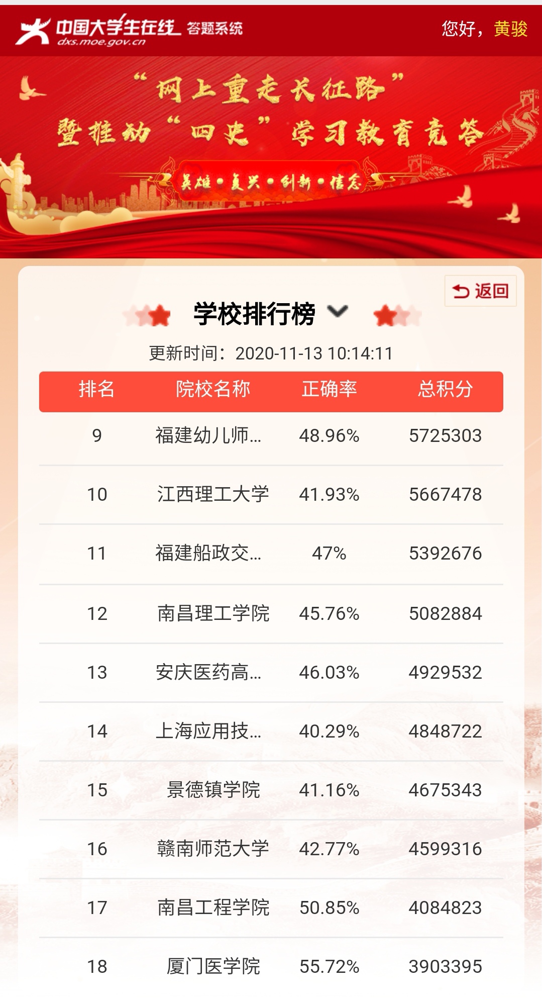 从11月4日至13日上午,我校有6500余名师生员工注册参加竞答活动,总得分在全国学校排行榜中排名第十三,安徽省高校排行榜中排行榜首。