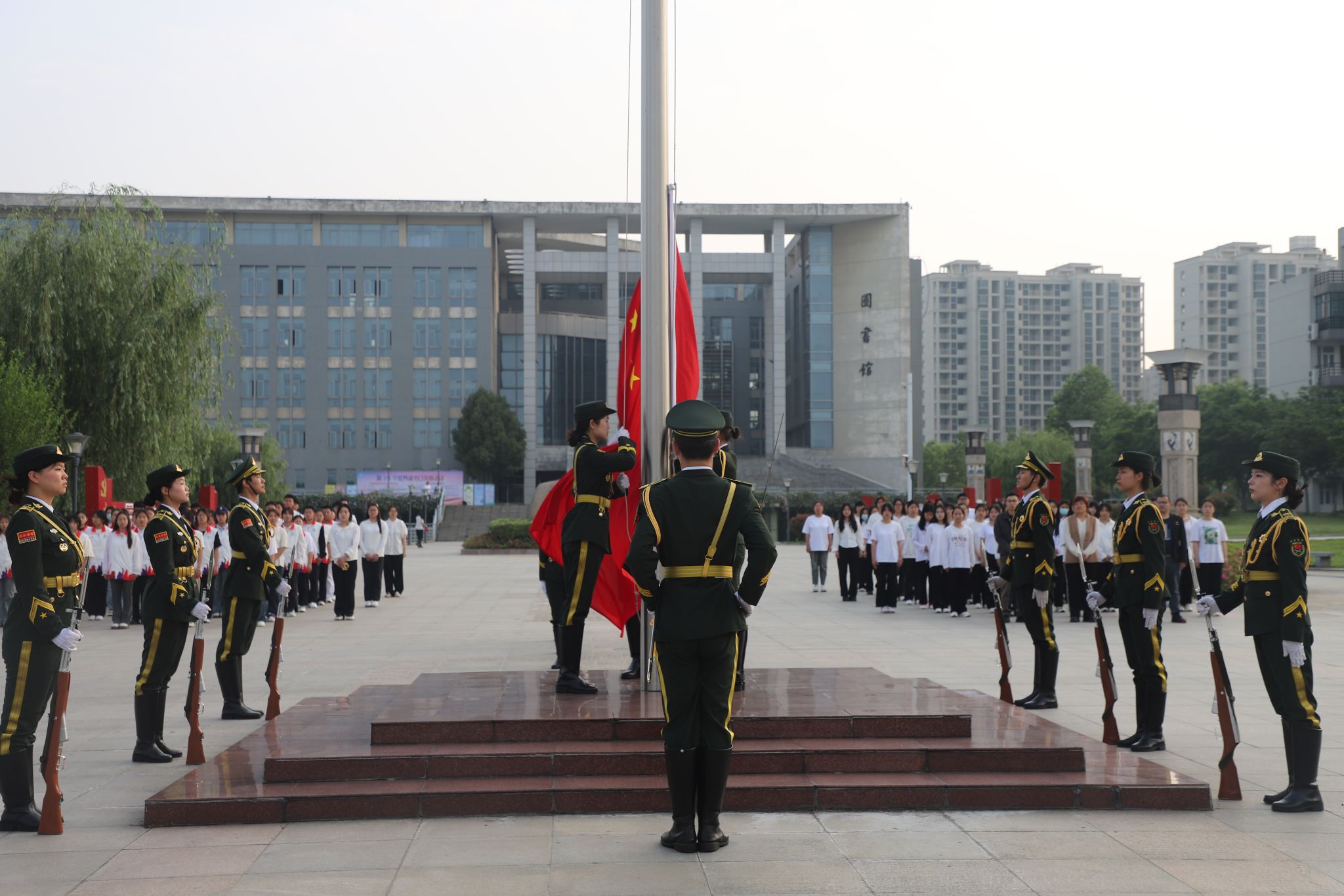 上午七时整,升旗仪式在雄浑激昂的国歌声中拉开帷幕。国旗护卫队队员朝气蓬勃、意气风发,踏着整齐有力的步伐迈向升旗台。国歌奏响,全场肃立,在庄严肃穆的旋律中,鲜艳的五星红旗徐徐升起,全体师生神情庄重,满怀对伟大祖国的热爱与敬意,面向五星红旗行注目礼。