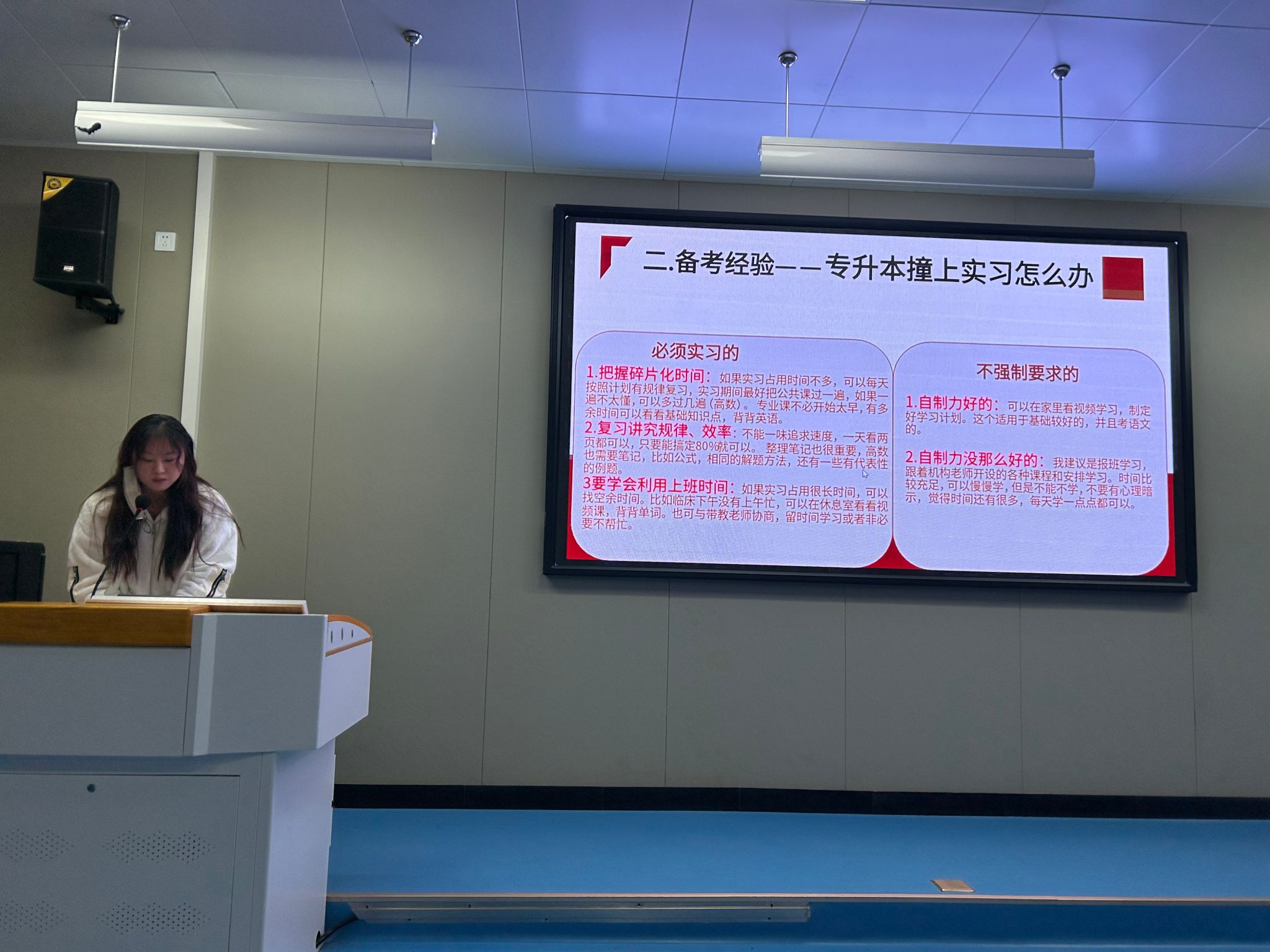 23级药学本科班邓子龙同学谈吐有致,干货满满,他从树立专升本目标、报班建议、记忆攻略、英语学习和时间管理方面作分享交流;22级康复治疗学本科班张文慧分享了自己专升本的坎坷经历,重点强调了实习时间的利用和英语、高数的学习;22级护理本科班杨欣妍的分享细致入微,面面俱到,她从专升本择校、考试科目、考试流程、专业知识学习、学习方法和平台、解剖生理的重要性甚至不同题型的学习都做了深入的讲解;23级药学本科班朱文静的分享热情洋溢,她从时间管理、制定学习计划、如何提升专注力、学习方法、专业课学习等方面作分享交流,并号召同学们坚定目标,迎难而上。