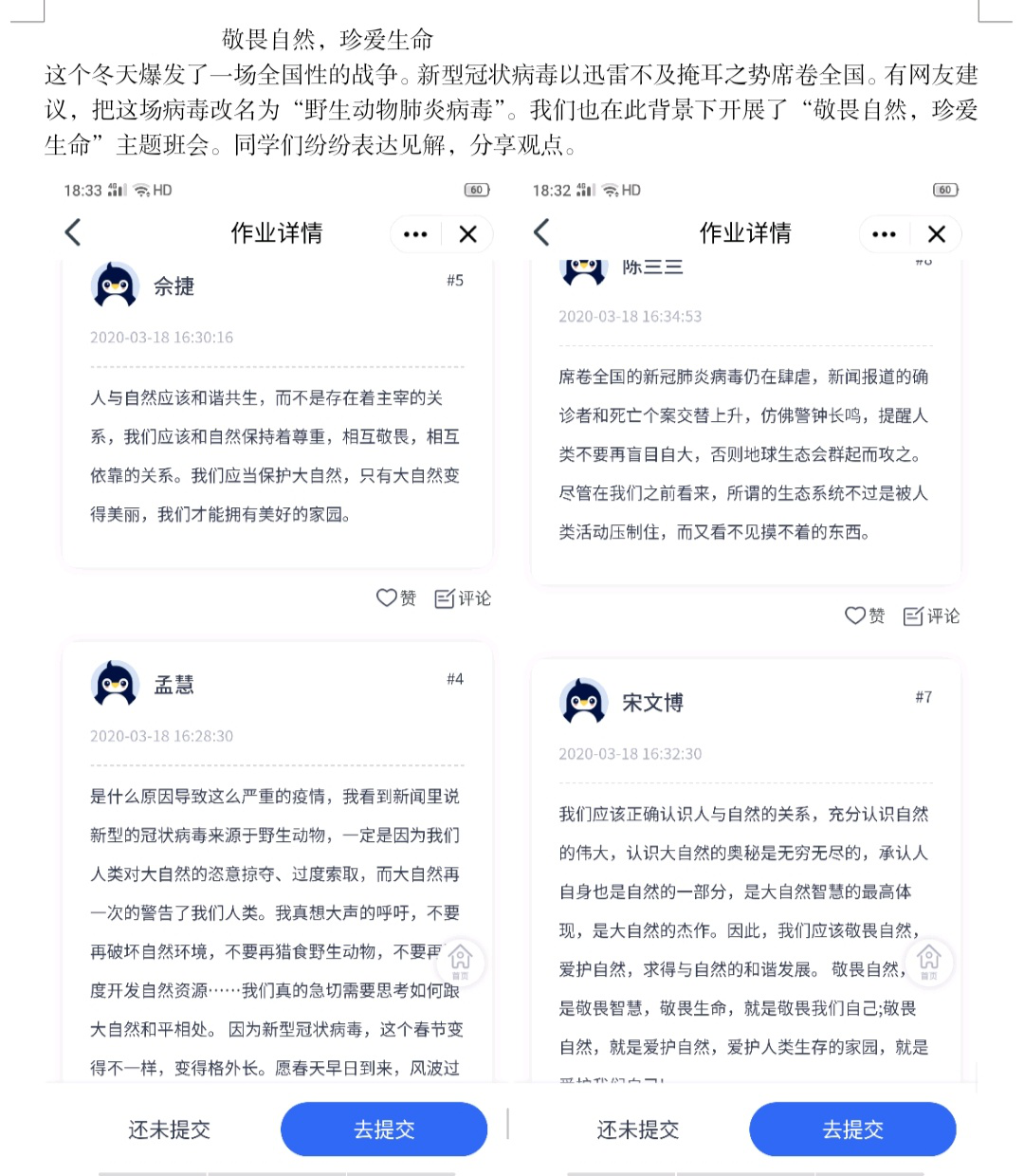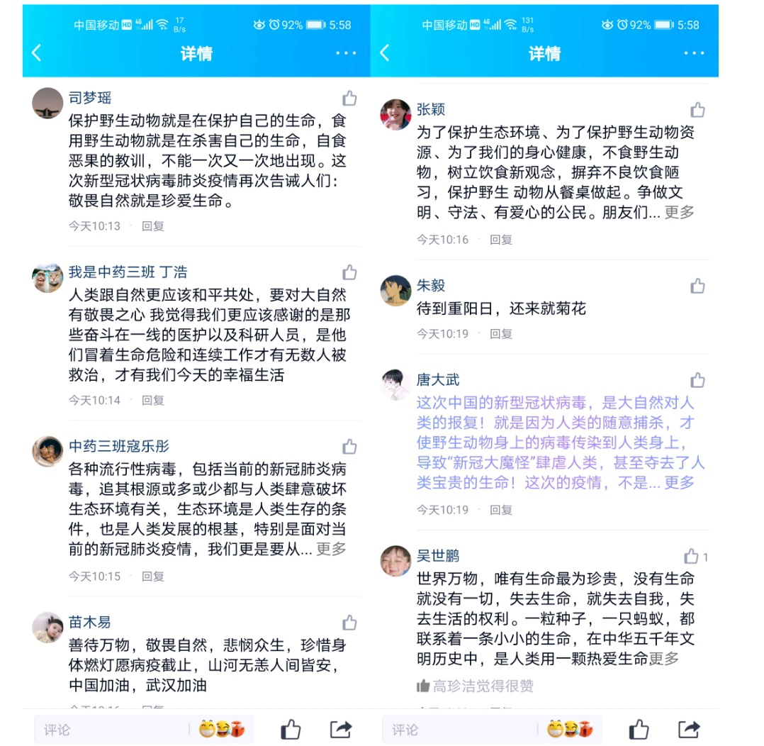 “残酷的传染疫情背后,是一场场残酷的猎杀行动,是一曲曲野生动物的悲歌!新型传染病的发生,一定意义上,就是野生动物对人类的报复,是大自然对人类的惩罚。”一段段极具感染力的文字,一张张丰富的图片,让同学们陷入沉思。我们唏嘘生命在病毒面前的不堪一击,我们赞叹在危机中带着坚定信念迎难而上的“最美逆行者”。连麦互动时,同学们积极表达自己的感受,精彩语录层出不穷。他们一字一句,告诉我们在人类与自然的相处中,究竟什么能做?什么不能做!