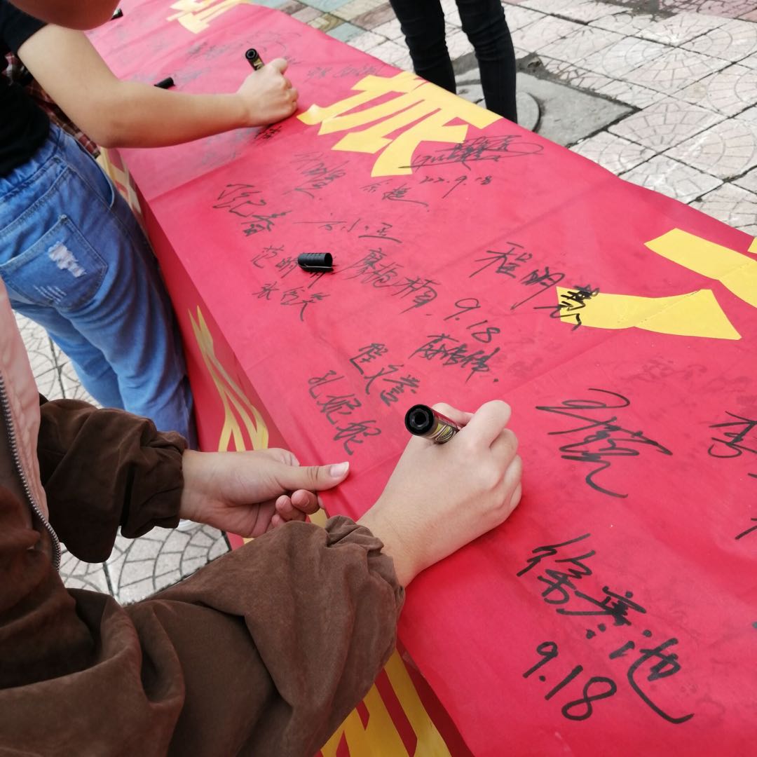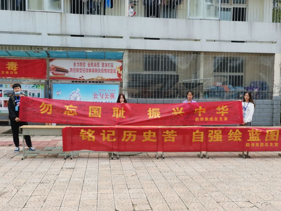 9月18日上午9点18分,校园内拉响了防空警报,警报响起提醒着同学们虽然处在和平年代但仍须警钟长鸣。中午,药学系同学在食堂门口拉条幅举行宣誓签名活动,普及历史事件,感受先烈情怀。
