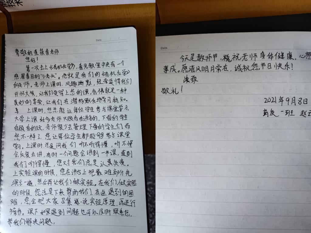 2021年9月10日是第37个教师节,为进一步在全校营造尊师重教的氛围,弘扬尊师重教的良好风尚,推进校园和谐建设,药学系举办了以“师生情谊我诉述”为主题的感恩信活动。