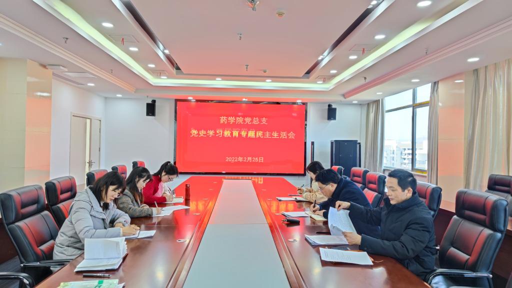 根据《安庆医药高等专科学校关于开好党史学习教育专题民主生活会的通知》(庆医专党发[2022]8号)要求,2月25日中午,药学院党总支在图书馆六楼会议室召开2021年度党史学习教育专题民主生活会。校党委委员、副校长朱庆丰到会指导,组织人事处工作人员、学院党总支班子成员参加,会议由校党委委员、药学院党总支书记刘毅主持。