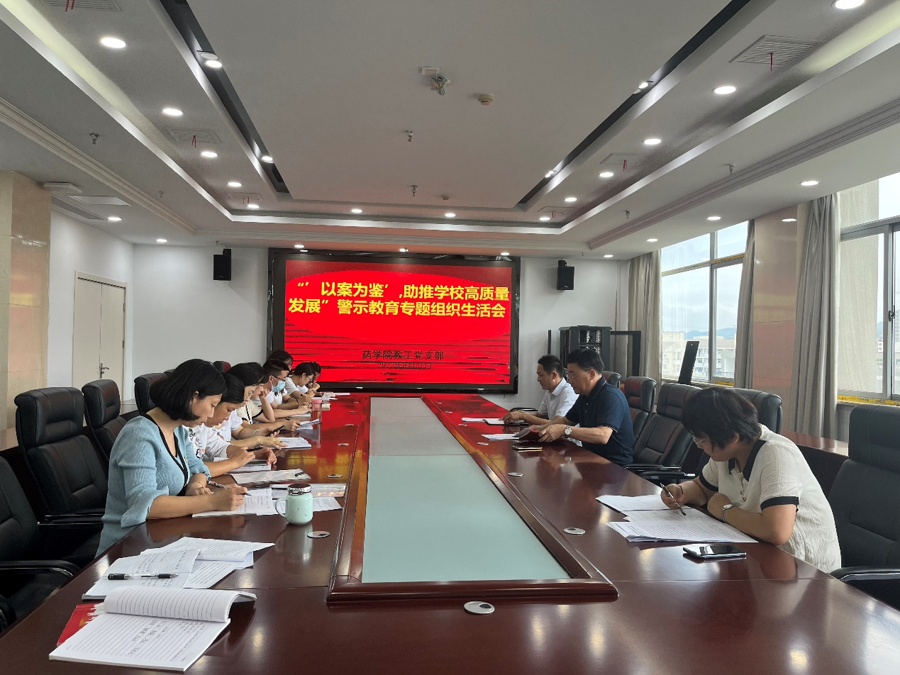 2022年8月31日,药学院教工党支部召开“以案为鉴,助推学校高质量发展”警示教育专题组织生活会。校党委委员、副校长朱庆丰以普通党员身份出席了会议,校党委委员、药学院党总支书记刘毅及支部全体党员参加会议。